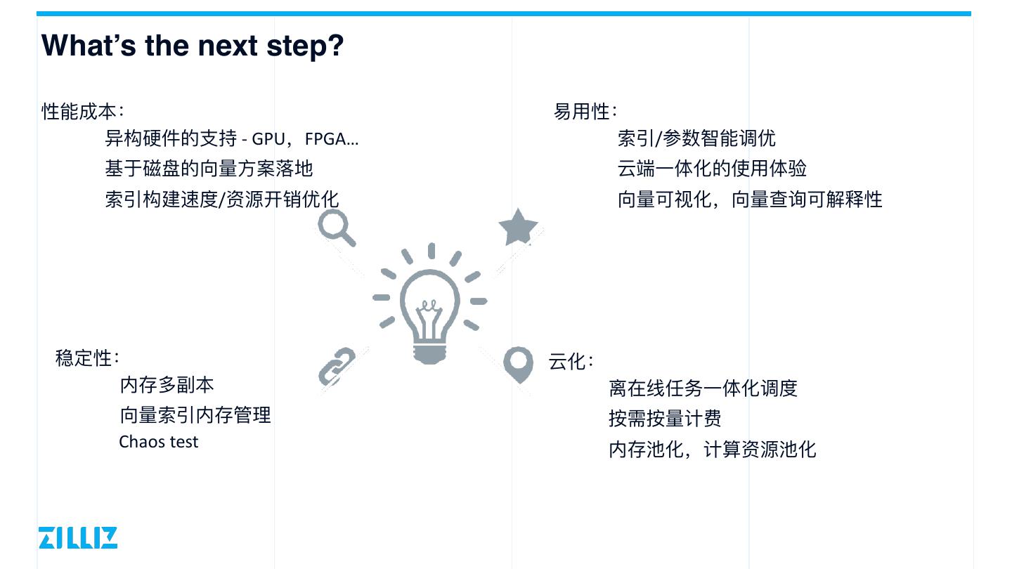 14 .What’s the next step? 性能成本: 易⽤性: 异构硬件的⽀持 - GPU,FPGA… 索引/参数智能调优 基于磁盘的向量⽅案落地 云端⼀体化的使⽤体验 索引构建速度/资源开销优化 向量可视化,向量查询可解释性 稳定性: 云化: 内存多副本 离在线任务⼀体化调度 向量索引内存管理 按需按量计费 Chaos test 内存池化,计算资源池化