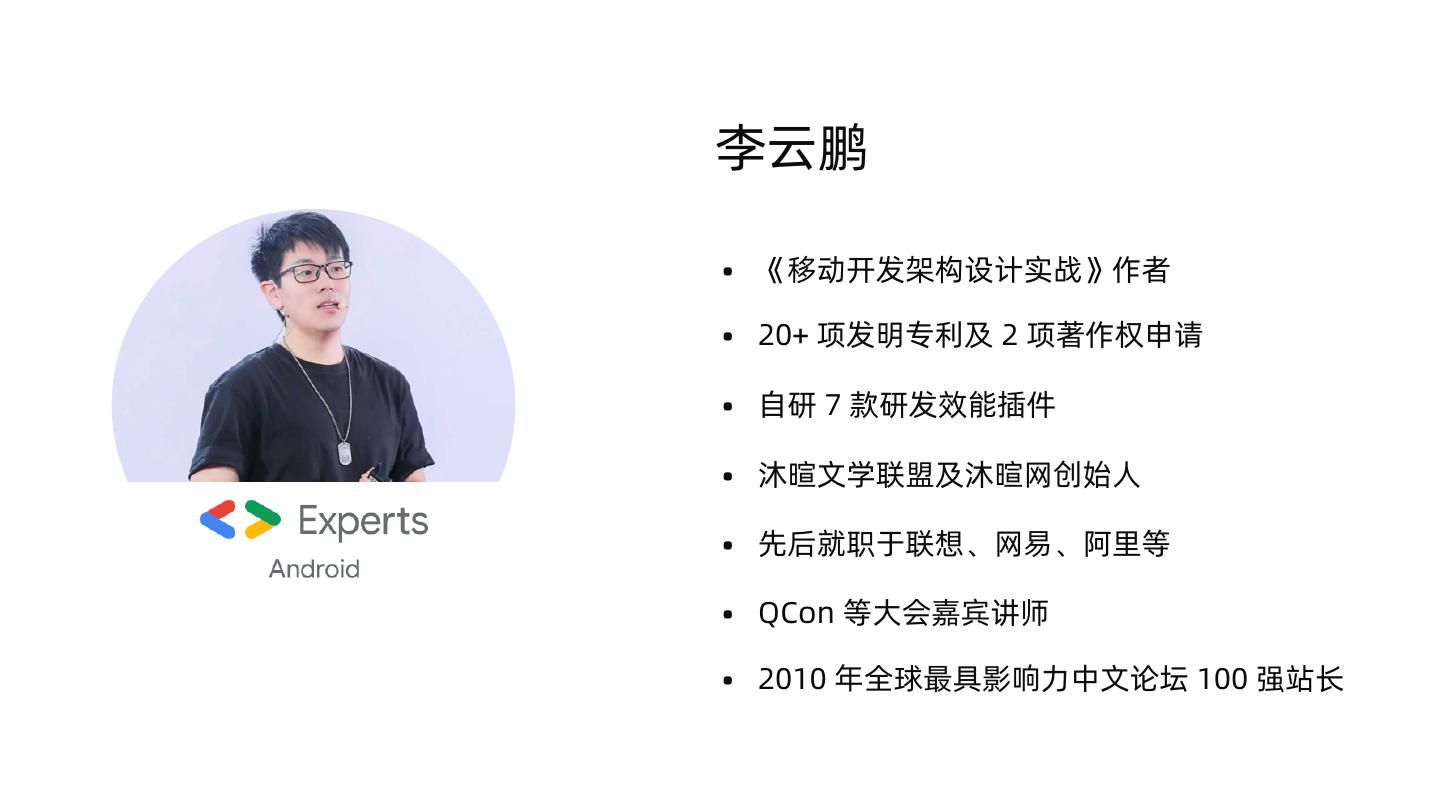 2 .李云鹏 • 《移动开发架构设计实战》作者 • 20+ 项发明专利及 2 项著作权申请 • 自研 7 款研发效能插件 • 沐暄文学联盟及沐暄网创始人 • 先后就职于联想、网易、阿里等 • QCon 等大会嘉宾讲师 • 2010 年全球最具影响力中文论坛 100 强站长