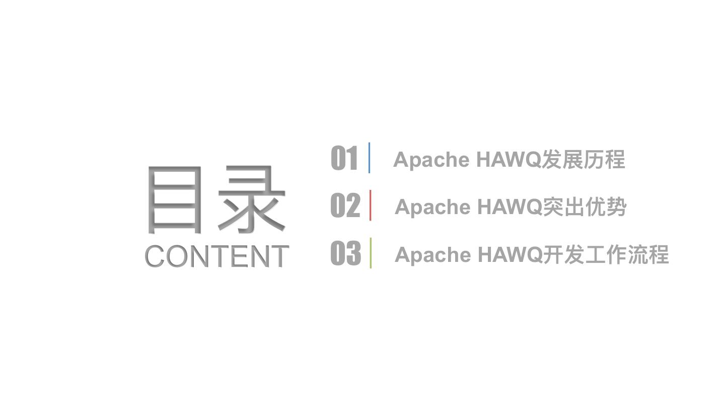 3 . 01 ⽬目录 Apache HAWQ发展历程 02 Apache HAWQ突出优势 CONTENT 03 Apache HAWQ开发⼯工作流程