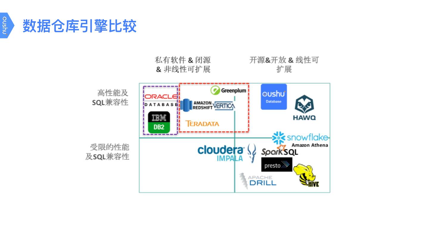9 .HAWQ/OushuDB VS GPDB • 架构:存储与计算完全分离 VS 传统MPP数据库 • 性能:全新SIMD执⾏行行器器 VS ⽼老老执⾏行行器器 • 扩展性:弹性伸缩,动态秒级扩容 VS 扩容相对复杂,⼤大量量数据重分布 • 云原⽣生:云数据库 VS ⾮非云数据库 • Hadoop原⽣生:SQL on Hadoop引擎 VS 只能通过PXF访问HDFS • 数据共享:可插拔独⽴立存储 VS 私有存储 • 资源管理理:树状多级资源管理理队列列 VS 单级资源管理理队列列