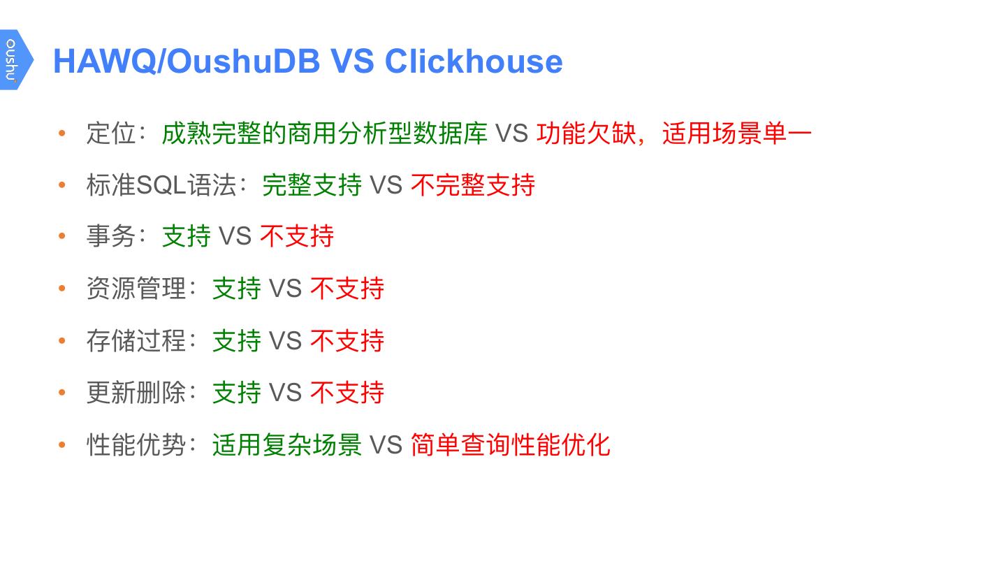 10 .HAWQ/OushuDB VS Clickhouse • 定位:成熟完整的商⽤用分析型数据库 VS 功能⽋欠缺,适⽤用场景单⼀一 • 标准SQL语法:完整⽀支持 VS 不不完整⽀支持 • 事务:⽀支持 VS 不不⽀支持 • 资源管理理:⽀支持 VS 不不⽀支持 • 存储过程:⽀支持 VS 不不⽀支持 • 更更新删除:⽀支持 VS 不不⽀支持 • 性能优势:适⽤用复杂场景 VS 简单查询性能优化