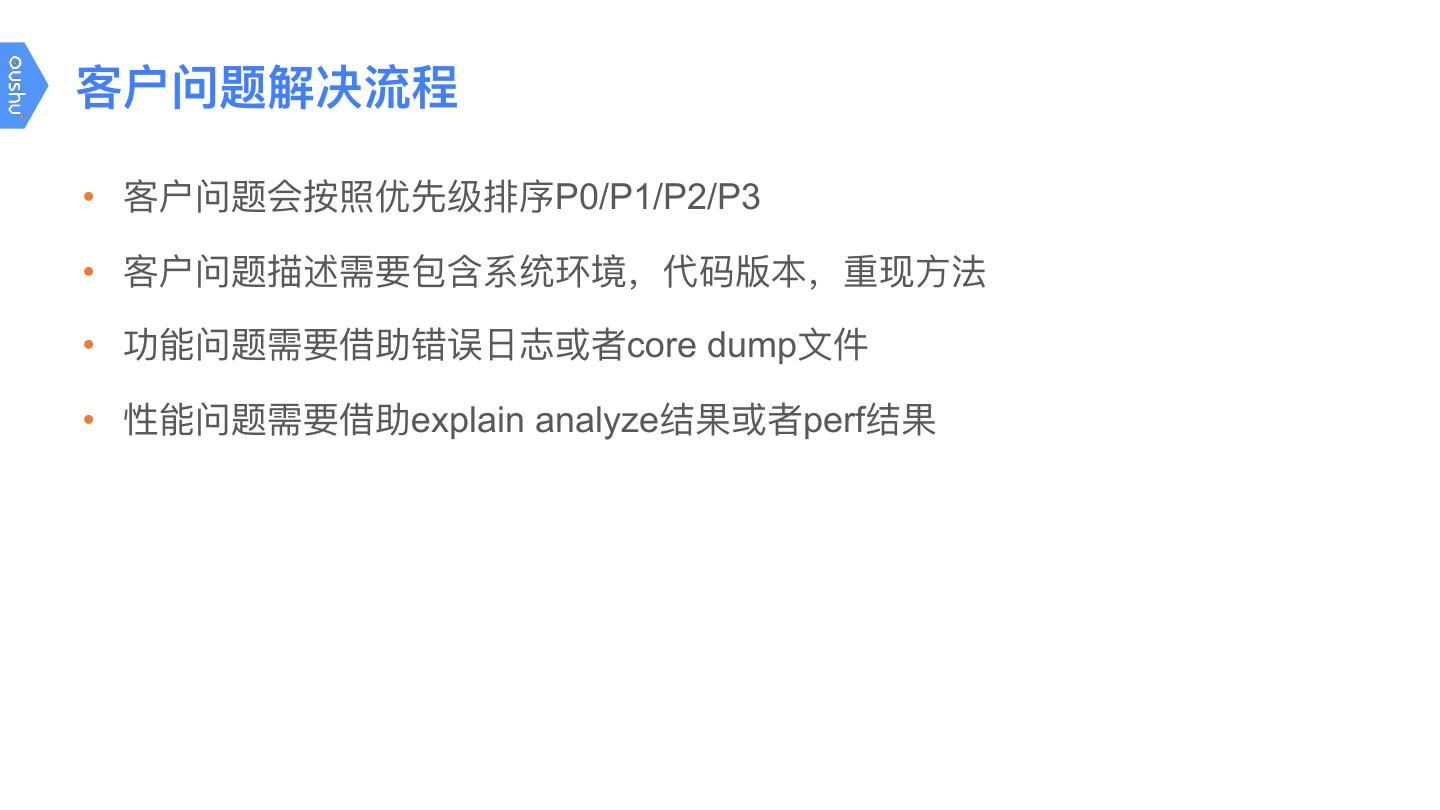 14 .客户问题解决流程 • 客户问题会按照优先级排序P0/P1/P2/P3 • 客户问题描述需要包含系统环境,代码版本,重现⽅方法 • 功能问题需要借助错误⽇日志或者core dump⽂文件 • 性能问题需要借助explain analyze结果或者perf结果