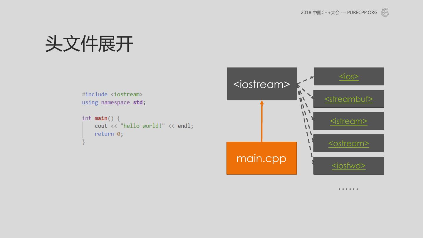 6 . 2018 中国C++大会 — PURECPP.ORG 头文件展开 <ios> <iostream> <streambuf> <istream> <ostream> main.cpp <iosfwd> ……