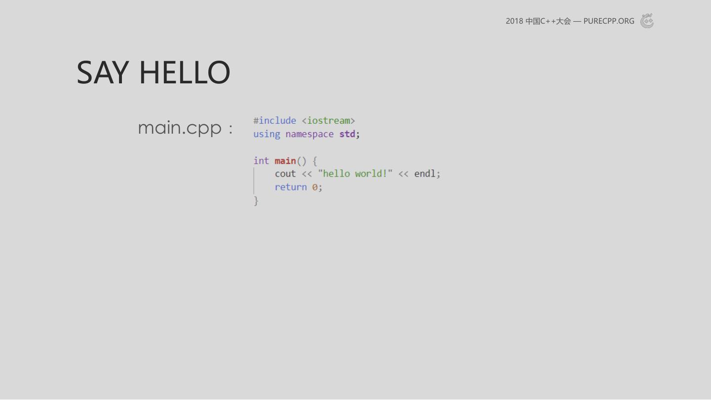 22 . 2018 中国C++大会 — PURECPP.ORG SAY HELLO main.cpp: