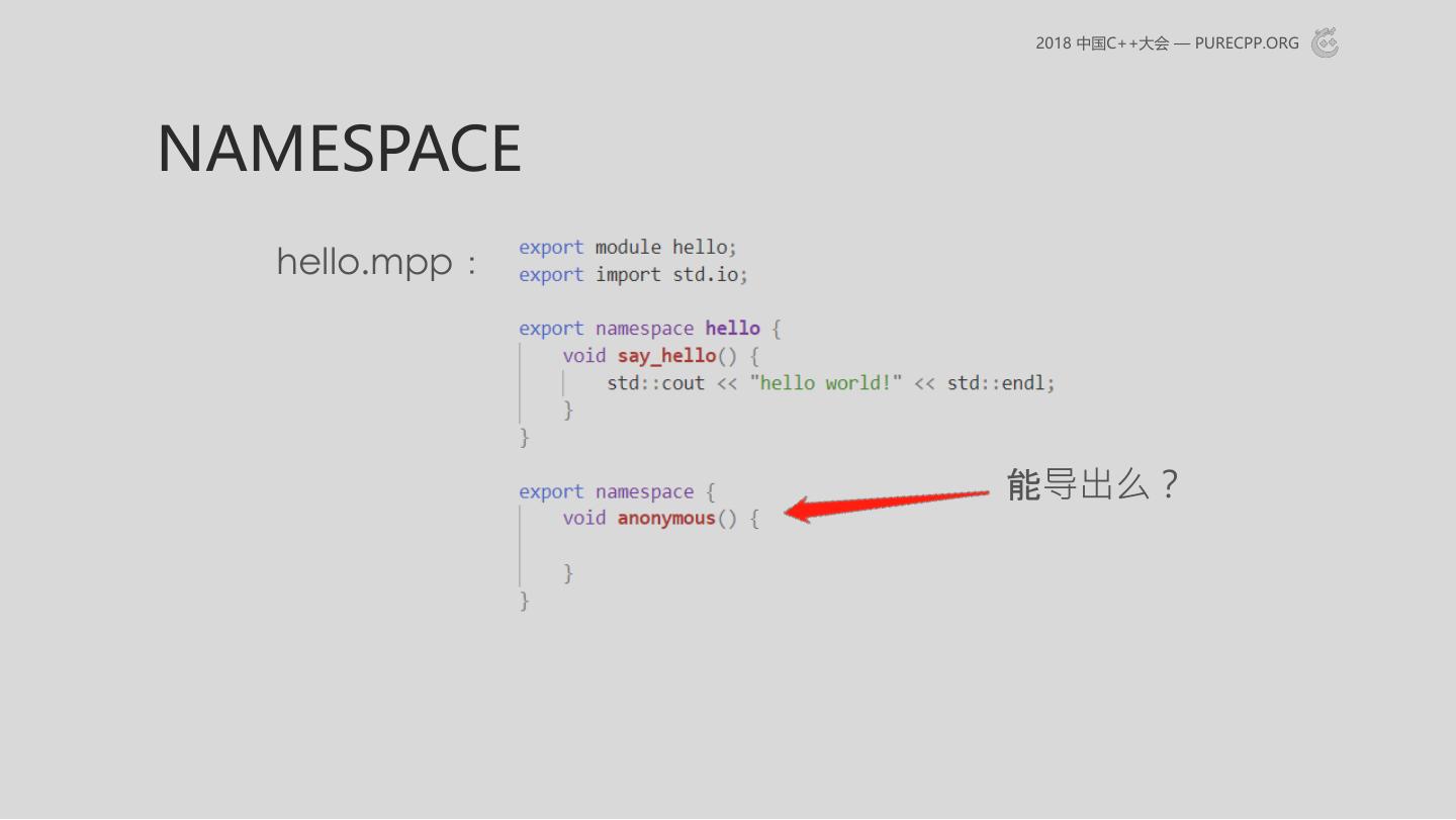 23 . 2018 中国C++大会 — PURECPP.ORG 自定义MODULE module interface unit hello.mpp: main.cpp: