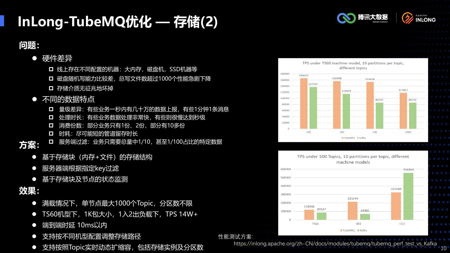 10 .InLong-TubeMQ优化 — 存储(2) 问题: ⚫ 硬件差异 线上存在不同配置的机器:大内存,磁盘机,SSD机器等 磁盘随机写能力比较差,总写文件数超过1000个性能急剧下降 存储介质无征兆地坏掉 ⚫ 不同的数据特点 量级差异:有些业务一秒内有几十万的数据上报,有些1分钟1条消息 处理时长:有些业务数据处理非常快,有些则很慢达到秒级 消费份数:部分业务只有1份、2份,部分有10多份 时耗:尽可能短的管道留存时长 服务端过滤:业务只需要总量中1/10,甚至1/100占比的特定数据 方案: ⚫ 基于存储块(内存+文件)的存储结构 ⚫ 服务器端根据指定key过滤 ⚫ 基于存储块及节点的状态监测 效果: ⚫ 满载情况下,单节点最大1000个Topic,分区数不限 ⚫ TS60机型下,1K包大小,1入2出负载下,TPS 14W+ ⚫ 端到端时延 10ms以内 ⚫ 支持按不同机型配置调整存储路径 性能测试方案: https://inlong.apache.org/zh-CN/docs/modules/tubemq/tubemq_perf_test_vs_Kafka ⚫ 支持按照Topic实时动态扩缩容,包括存储实例及分区数 10