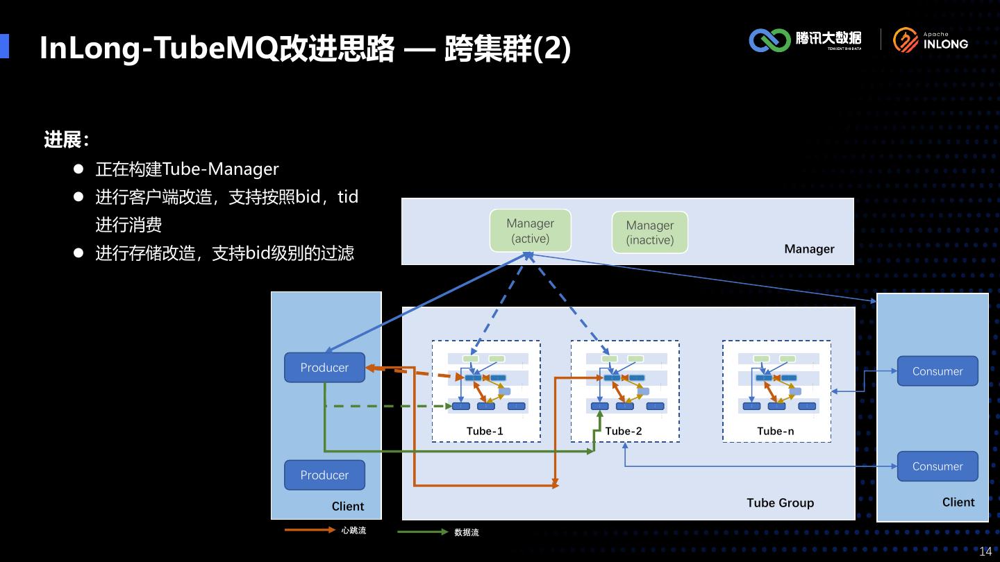 13 .InLong-TubeMQ改进思路 — 跨集群(1) 问题: ⚫ 数据冷热不均 ⚫ 单节点或单集群资源有限 Consumer 1-1 Topic 1 Consumer 方案: b1-t1 b1-t2 b1-t3 b1-tn 1-2 Group-1 ⚫ 基于Bid,Tid构建上报及消费维度 Topic 2 b2-t1 b2-t2 b2-t3 b2-tn ⚫ 基于Topic聚合及跨Topic、跨集群上报及消费 b3-t1 b3-t3 …… Consumer 2-1 Topic x Consumer 状态: …… b3-t2 b3-tn b1t1 b1t2 b1t3 b1tn 2-2 Topic m Group-2 ⚫ 改进中 b2t1 b2t2 b2t3 b2tn Bid,Tid 与 Topic b4-t1 …… b4-t2 映射关系 b3t1 b3t2 b3t3 b3tn Cluster1 Consumer bmt1 bmt2 bmt3 bmtn 3-1 Topic n bid + tid Consumer b4-t3 b4-tn …… 3-2 Cluster2 Group-3 数据上报流 数据路由 数据存储 数据消费 13
