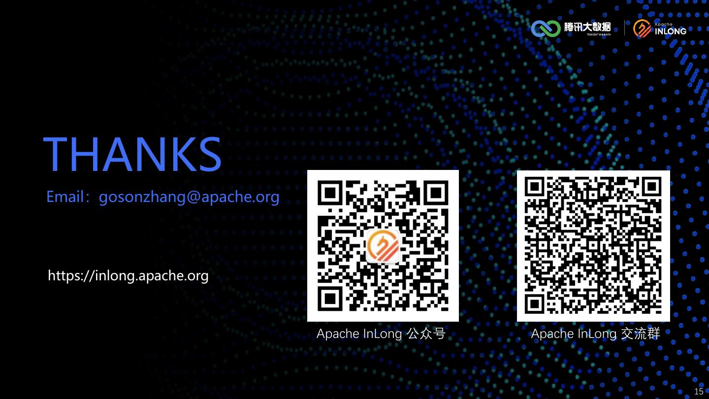 15 .THANKS Email:gosonzhang@apache.org https://inlong.apache.org Apache InLong 公众号 Apache InLong 交流群 15