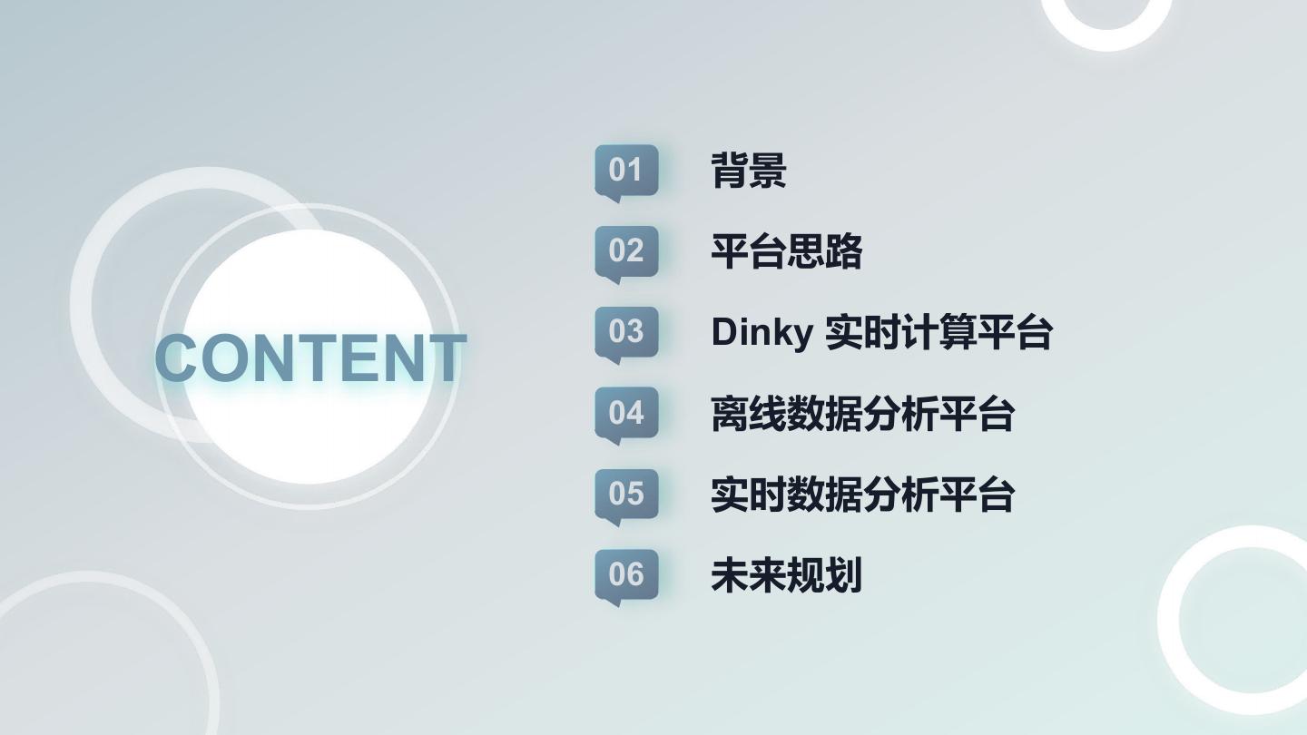 2 . 01 背景 02 平台思路 03 Dinky 实时计算平台 CONTENT 04 离线数据分析平台 05 实时数据分析平台 06 未来规划