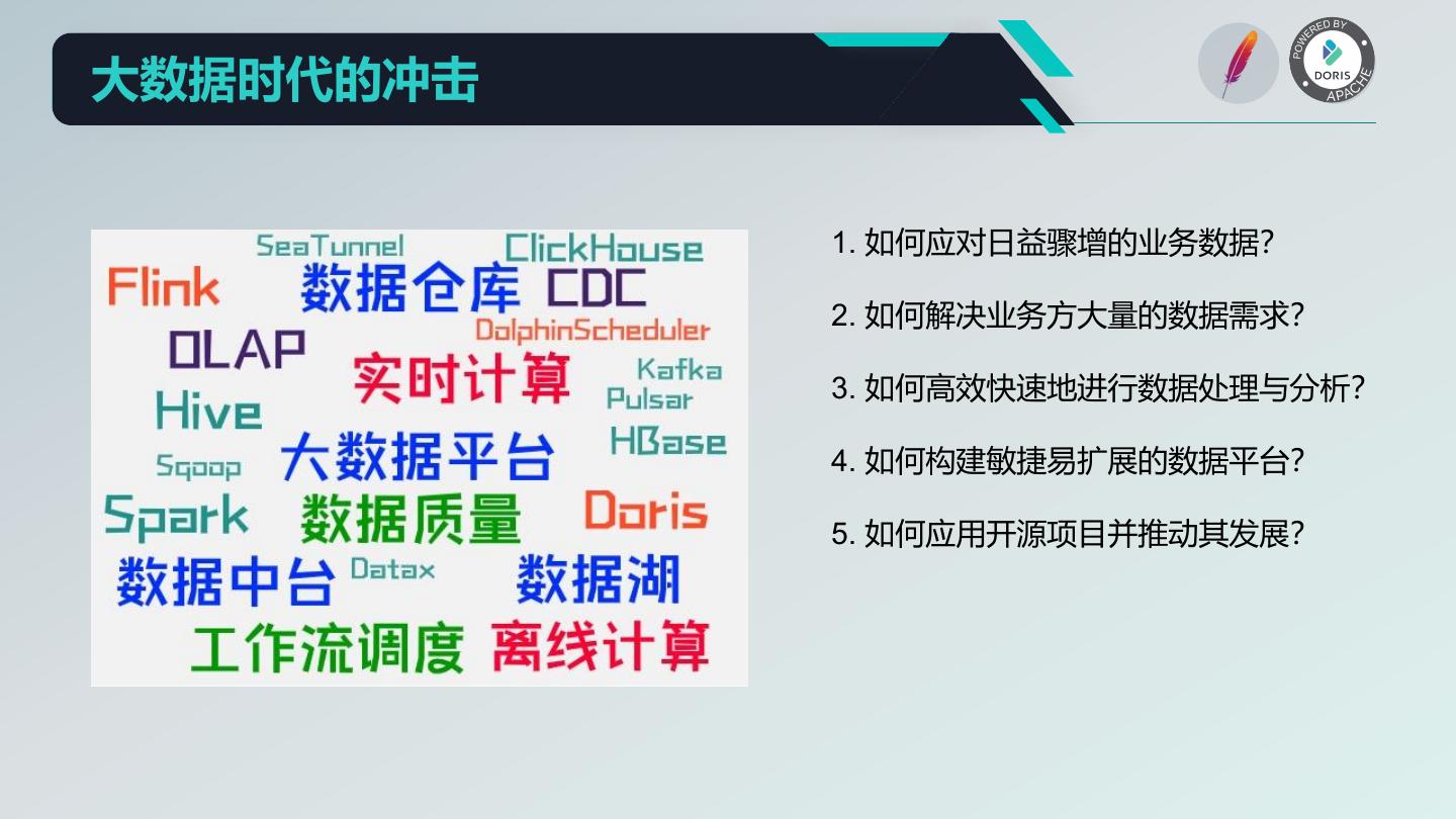 4 .大数据时代的冲击 1. 如何应对日益骤增的业务数据? 2. 如何解决业务方大量的数据需求? 3. 如何高效快速地进行数据处理与分析? 4. 如何构建敏捷易扩展的数据平台? 5. 如何应用开源项目并推动其发展?