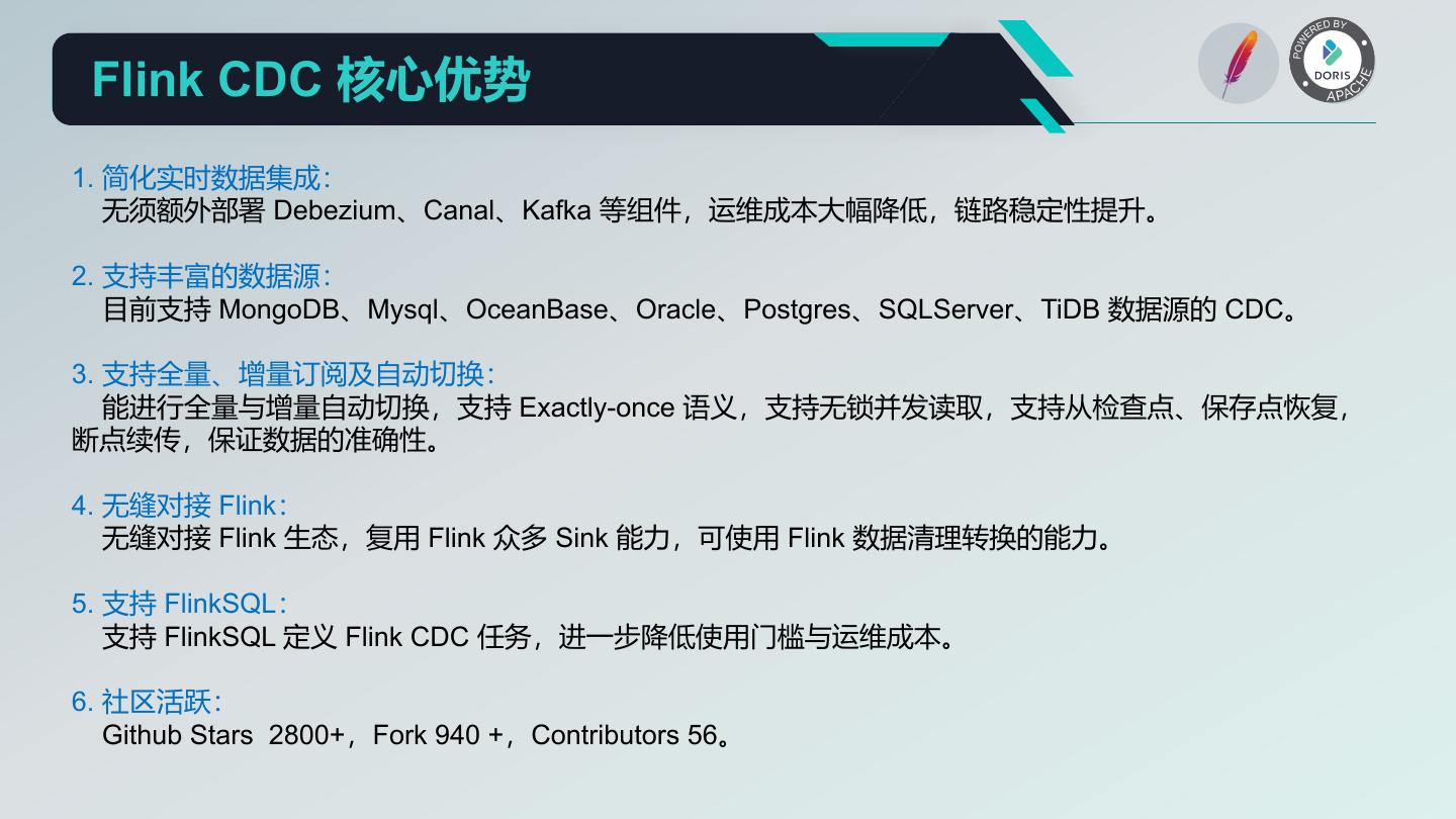 12 . Flink CDC 核心优势 1. 简化实时数据集成: 无须额外部署 Debezium、Canal、Kafka 等组件,运维成本大幅降低,链路稳定性提升。 2. 支持丰富的数据源: 目前支持 MongoDB、Mysql、OceanBase、Oracle、Postgres、SQLServer、TiDB 数据源的 CDC。 3. 支持全量、增量订阅及自动切换: 能进行全量与增量自动切换,支持 Exactly-once 语义,支持无锁并发读取,支持从检查点、保存点恢复, 断点续传,保证数据的准确性。 4. 无缝对接 Flink: 无缝对接 Flink 生态,复用 Flink 众多 Sink 能力,可使用 Flink 数据清理转换的能力。 5. 支持 FlinkSQL: 支持 FlinkSQL 定义 Flink CDC 任务,进一步降低使用门槛与运维成本。 6. 社区活跃: Github Stars 2800+,Fork 940 +,Contributors 56。