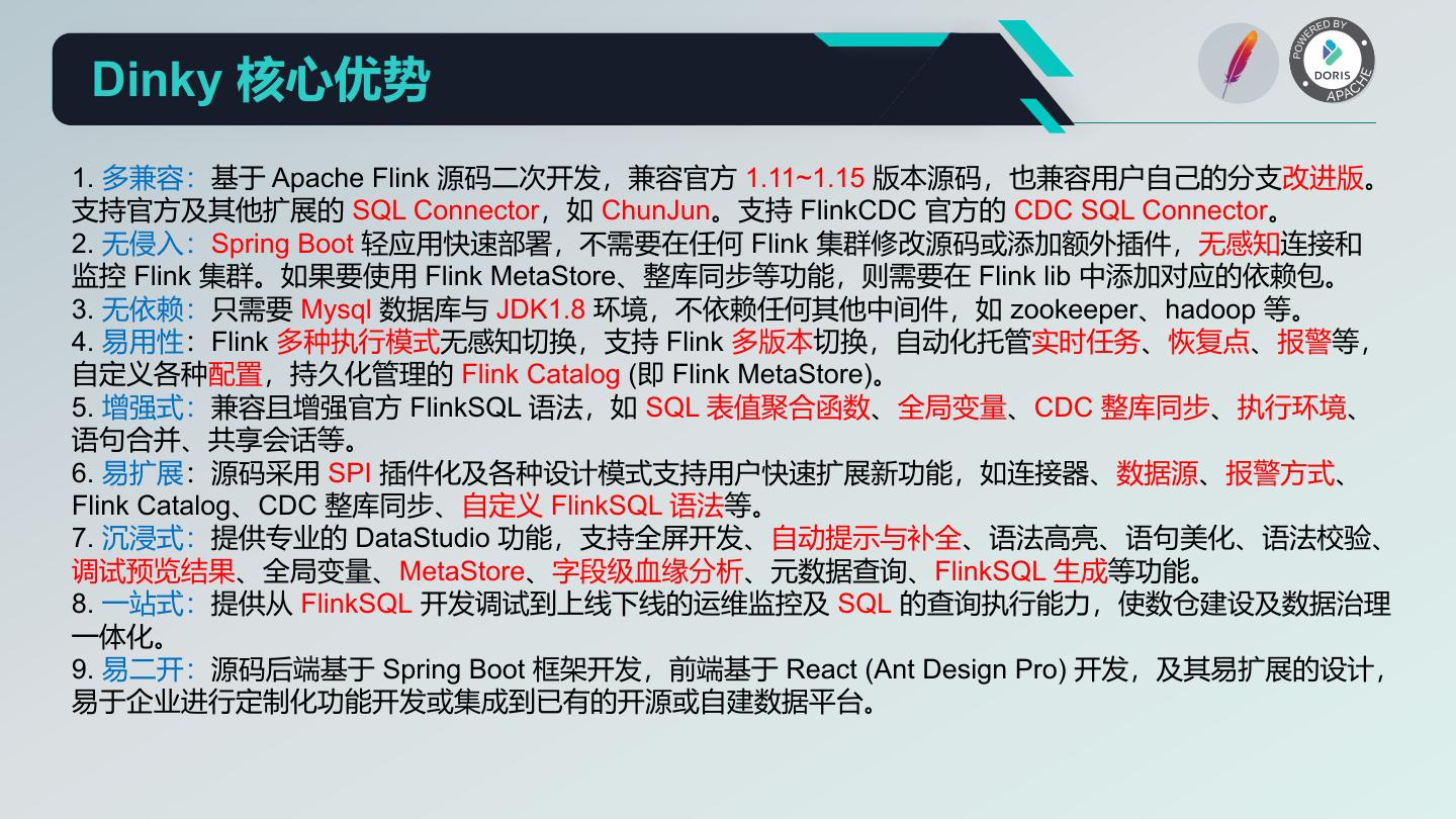 22 . Dinky 核心优势 1. 多兼容:基于 Apache Flink 源码二次开发,兼容官方 1.11~1.15 版本源码,也兼容用户自己的分支改进版。 支持官方及其他扩展的 SQL Connector,如 ChunJun。支持 FlinkCDC 官方的 CDC SQL Connector。 2. 无侵入:Spring Boot 轻应用快速部署,不需要在任何 Flink 集群修改源码或添加额外插件,无感知连接和 监控 Flink 集群。如果要使用 Flink MetaStore、整库同步等功能,则需要在 Flink lib 中添加对应的依赖包。 3. 无依赖:只需要 Mysql 数据库与 JDK1.8 环境,不依赖任何其他中间件,如 zookeeper、hadoop 等。 4. 易用性:Flink 多种执行模式无感知切换,支持 Flink 多版本切换,自动化托管实时任务、恢复点、报警等, 自定义各种配置,持久化管理的 Flink Catalog (即 Flink MetaStore)。 5. 增强式:兼容且增强官方 FlinkSQL 语法,如 SQL 表值聚合函数、全局变量、CDC 整库同步、执行环境、 语句合并、共享会话等。 6. 易扩展:源码采用 SPI 插件化及各种设计模式支持用户快速扩展新功能,如连接器、数据源、报警方式、 Flink Catalog、CDC 整库同步、自定义 FlinkSQL 语法等。 7. 沉浸式:提供专业的 DataStudio 功能,支持全屏开发、自动提示与补全、语法高亮、语句美化、语法校验、 调试预览结果、全局变量、MetaStore、字段级血缘分析、元数据查询、FlinkSQL 生成等功能。 8. 一站式:提供从 FlinkSQL 开发调试到上线下线的运维监控及 SQL 的查询执行能力,使数仓建设及数据治理 一体化。 9. 易二开:源码后端基于 Spring Boot 框架开发,前端基于 React (Ant Design Pro) 开发,及其易扩展的设计, 易于企业进行定制化功能开发或集成到已有的开源或自建数据平台。