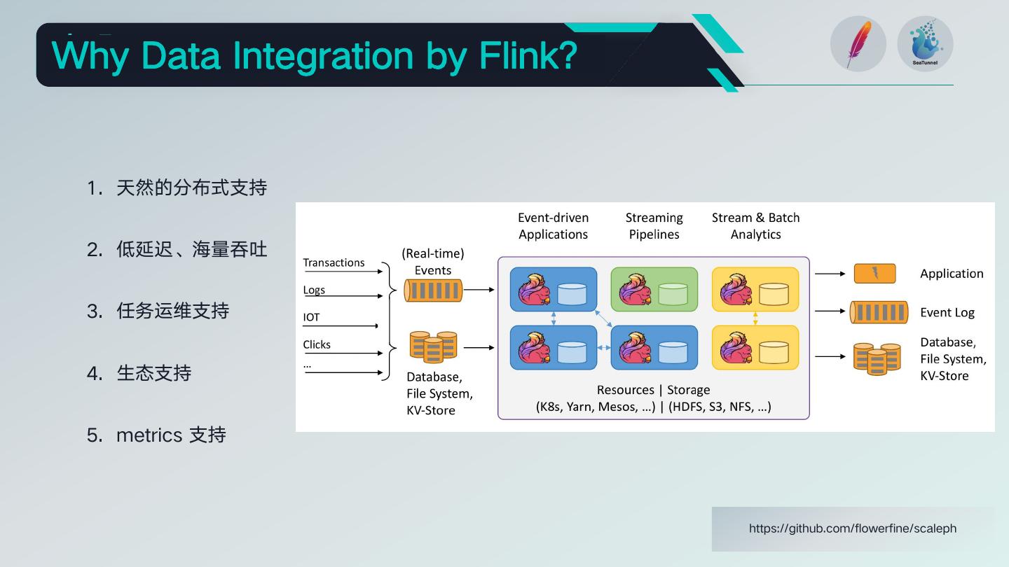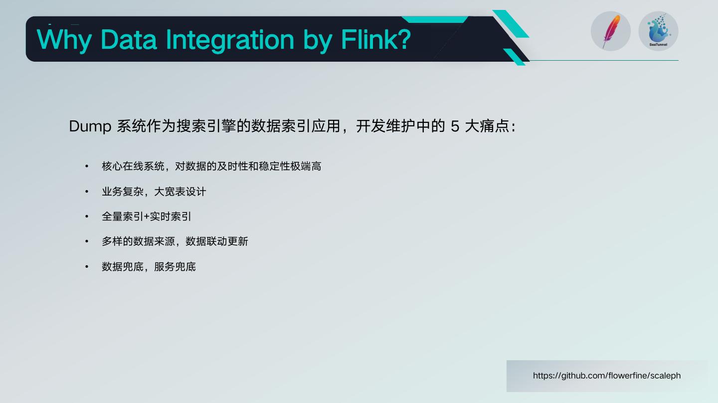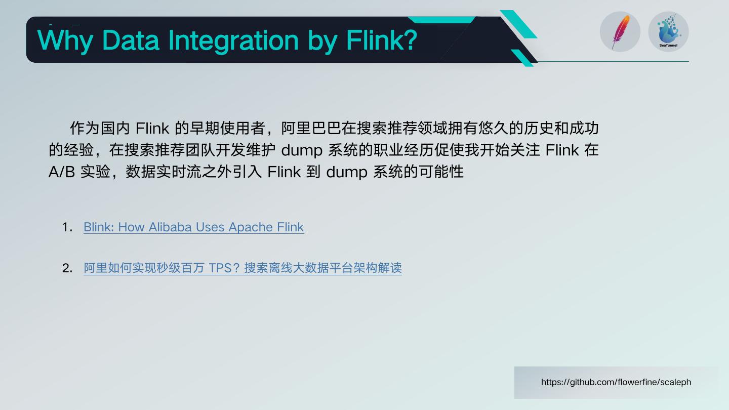 6 .标题 Data Integration by Flink? Why 作为国内 Flink 的早期使用者,阿里巴巴在搜索推荐领域拥有悠久的历史和成功 的经验,在搜索推荐团队开发维护 dump 系统的职业经历促使我开始关注 Flink 在 A/B 实验,数据实时流之外引入 Flink 到 dump 系统的可能性 1. Blink: How Alibaba Uses Apache Flink 2. 阿里如何实现秒级百万 TPS?搜索离线大数据平台架构解读 https://github.com/flowerfine/scaleph
