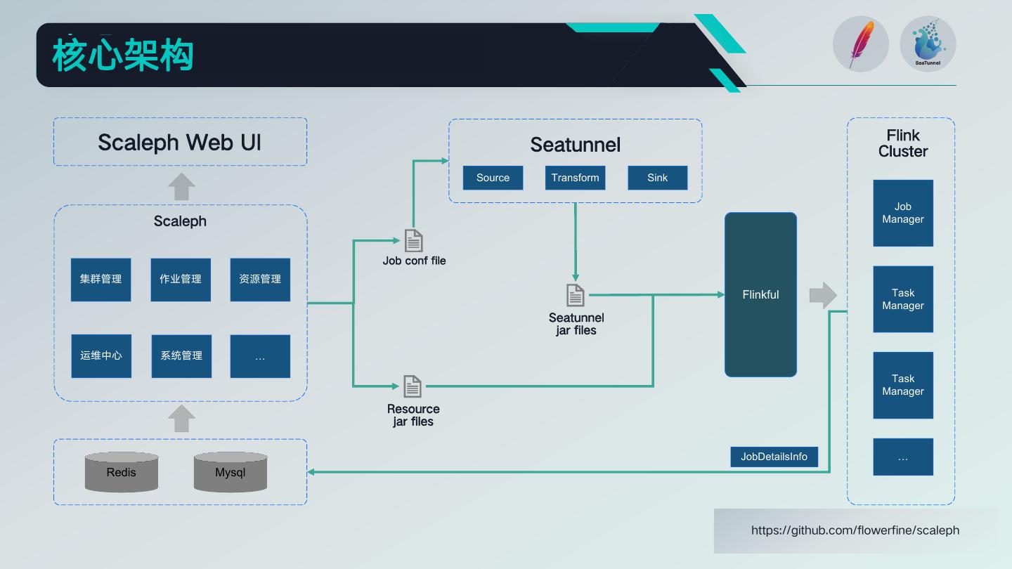 10 .标题 核心架构 Flink Scaleph Web UI Seatunnel Cluster Source Transform Sink Job Scaleph Manager Job conf file 集群管理 作业管理 资源管理 Flinkful Task Manager Seatunnel jar files 运维中心 系统管理 … Task Manager Resource jar files JobDetailsInfo … Redis Mysql https://github.com/flowerfine/scaleph