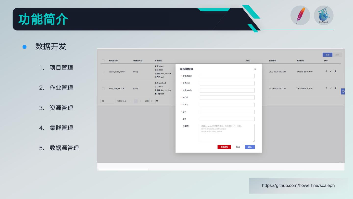 11 .标题 功能简介 数据开发 1. 项目管理 2. 作业管理 3. 资源管理 4. 集群管理 5. 数据源管理 https://github.com/flowerfine/scaleph