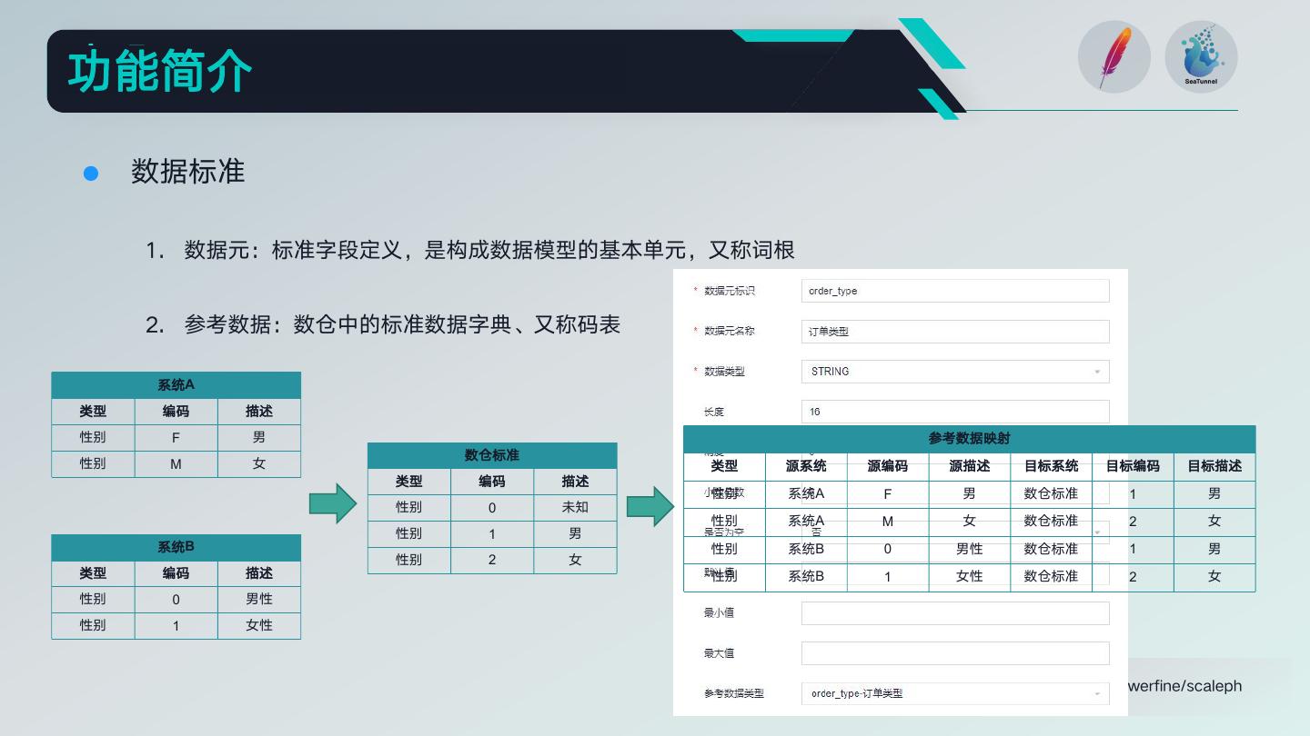 13 .标题 功能简介 数据标准 1. 数据元:标准字段定义,是构成数据模型的基本单元,又称词根 2. 参考数据:数仓中的标准数据字典、又称码表 系统A 类型 编码 描述 性别 F 男 参考数据映射 数仓标准 性别 M 女 类型 源系统 源编码 源描述 目标系统 目标编码 目标描述 类型 编码 描述 性别 系统A F 男 数仓标准 1 男 性别 0 未知 性别 系统A M 女 数仓标准 2 女 性别 1 男 系统B 性别 系统B 0 男性 数仓标准 1 男 性别 2 女 类型 编码 描述 性别 系统B 1 女性 数仓标准 2 女 性别 0 男性 性别 1 女性 https://github.com/flowerfine/scaleph