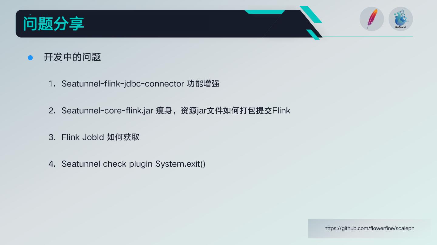 15 .标题 问题分享 开发中的问题 1. Seatunnel-flink-jdbc-connector 功能增强 2. Seatunnel-core-flink.jar 瘦身,资源jar文件如何打包提交Flink 3. Flink JobId 如何获取 4. Seatunnel check plugin System.exit() https://github.com/flowerfine/scaleph