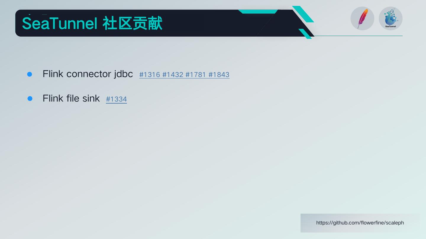 16 .标题 SeaTunnel 社区贡献 Flink connector jdbc #1316 #1432 #1781 #1843 Flink file sink #1334 https://github.com/flowerfine/scaleph