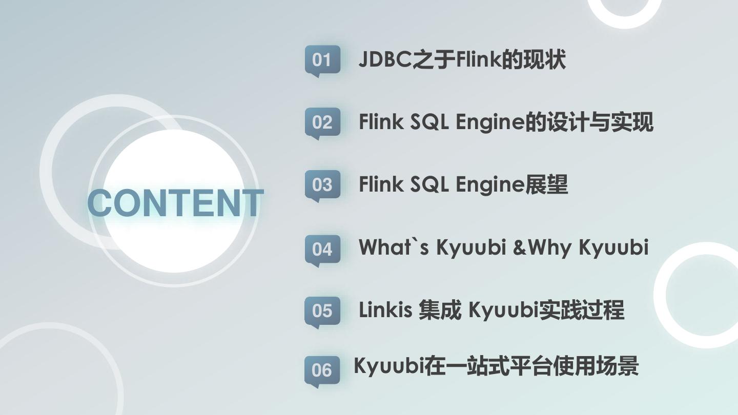 2 . 01 JDBC之于Flink的现状 02 Flink SQL Engine的设计与实现 03 Flink SQL Engine展望 CONTENT 04 What`s Kyuubi &Why Kyuubi 05 Linkis 集成 Kyuubi实践过程 06 Kyuubi在一站式平台使用场景