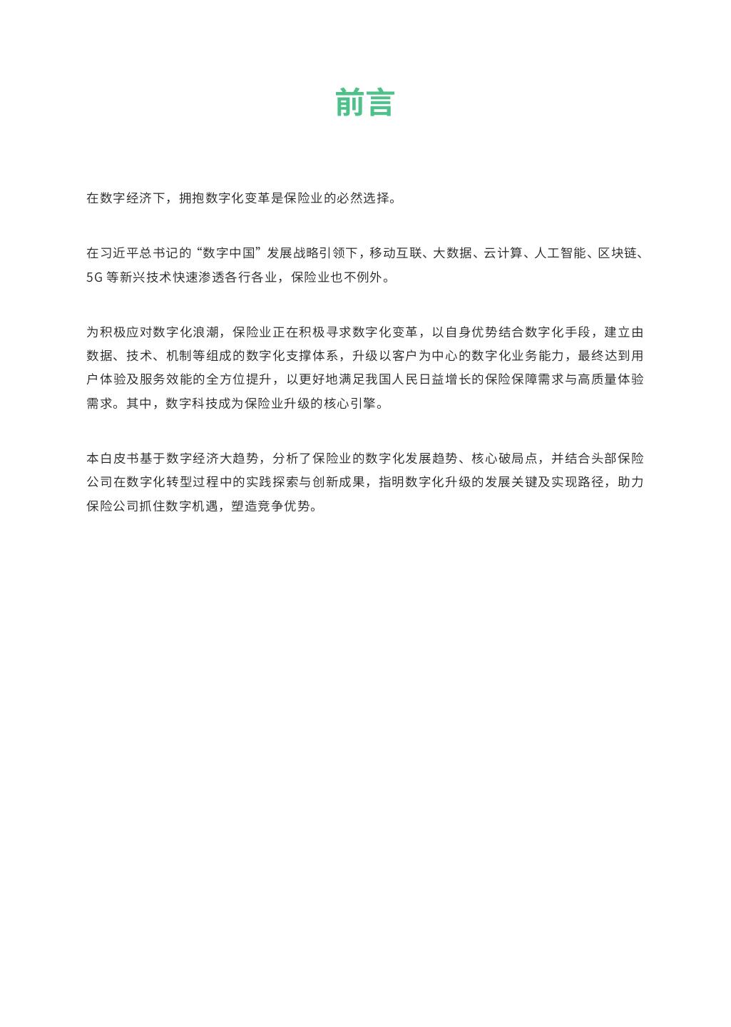2 . 前言 在数字经济下,拥抱数字化变革是保险业的必然选择。 在习近平总书记的“数字中国”发展战略引领下,移动互联、大数据、云计算、人工智能、区块链、 5G 等新兴技术快速渗透各行各业,保险业也不例外。 为积极应对数字化浪潮,保险业正在积极寻求数字化变革,以自身优势结合数字化手段,建立由 数据、技术、机制等组成的数字化支撑体系,升级以客户为中心的数字化业务能力,最终达到用 户体验及服务效能的全方位提升,以更好地满足我国人民日益增长的保险保障需求与高质量体验 需求。其中,数字科技成为保险业升级的核心引擎。 本白皮书基于数字经济大趋势,分析了保险业的数字化发展趋势、核心破局点,并结合头部保险 公司在数字化转型过程中的实践探索与创新成果,指明数字化升级的发展关键及实现路径,助力 保险公司抓住数字机遇,塑造竞争优势。