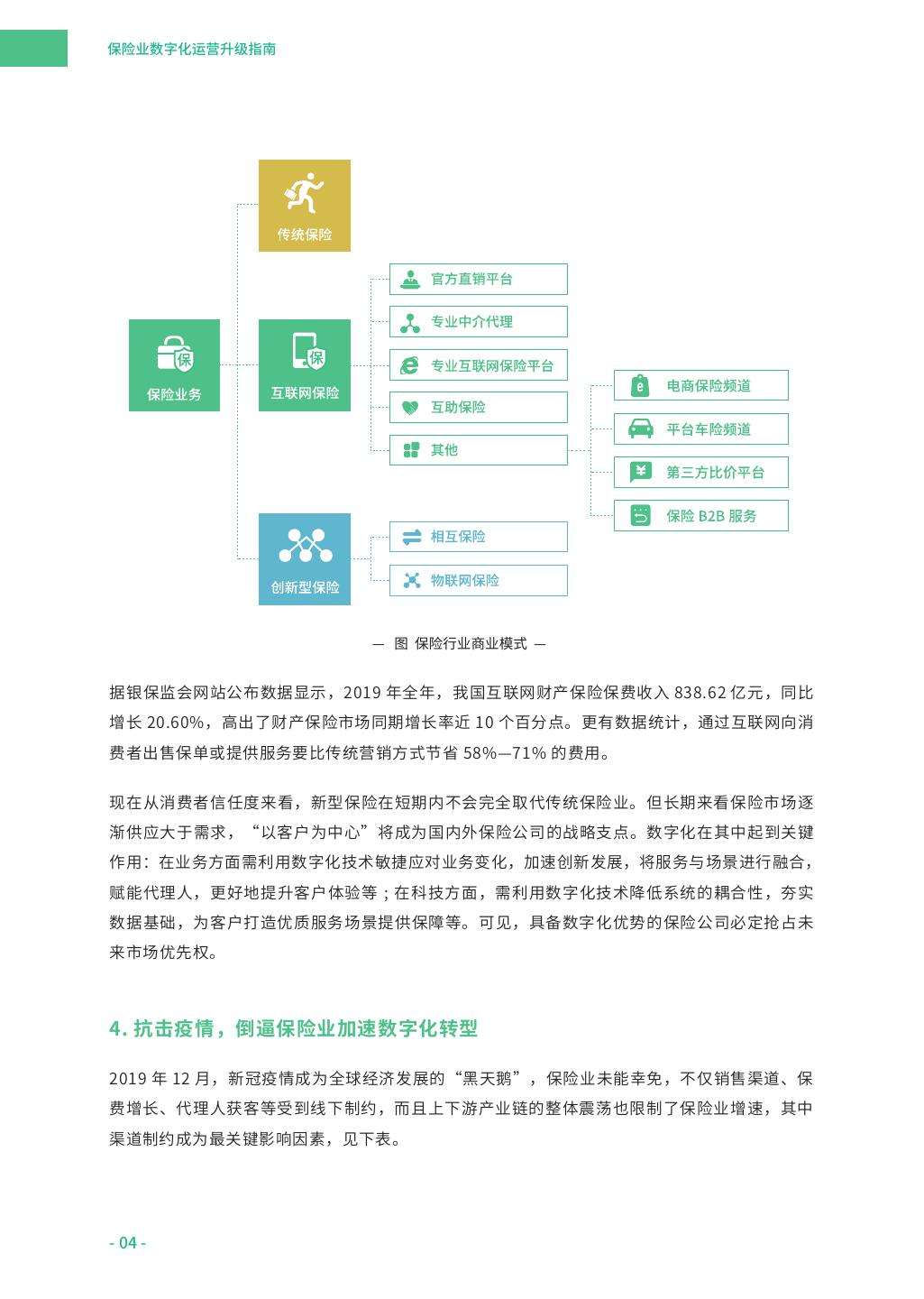 6 .保险业数字化运营升级指南 — 图 保险行业商业模式 — 据银保监会网站公布数据显示,2019 年全年,我国互联网财产保险保费收入 838.62 亿元,同比 增长 20.60%,高出了财产保险市场同期增长率近 10 个百分点。更有数据统计,通过互联网向消 费者出售保单或提供服务要比传统营销方式节省 58%—71% 的费用。 现在从消费者信任度来看,新型保险在短期内不会完全取代传统保险业。但长期来看保险市场逐 渐供应大于需求,“以客户为中心”将成为国内外保险公司的战略支点。数字化在其中起到关键 作用:在业务方面需利用数字化技术敏捷应对业务变化,加速创新发展,将服务与场景进行融合, 赋能代理人,更好地提升客户体验等 ; 在科技方面,需利用数字化技术降低系统的耦合性,夯实 数据基础,为客户打造优质服务场景提供保障等。可见,具备数字化优势的保险公司必定抢占未 来市场优先权。 4. 抗击疫情,倒逼保险业加速数字化转型 2019 年 12 月,新冠疫情成为全球经济发展的“黑天鹅”,保险业未能幸免,不仅销售渠道、保 费增长、代理人获客等受到线下制约,而且上下游产业链的整体震荡也限制了保险业增速,其中 渠道制约成为最关键影响因素,见下表。 - 04 -
