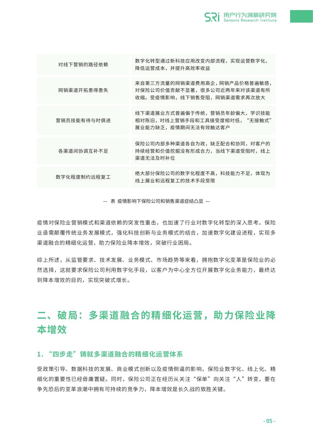 7 . 数字化转型通过新科技应用改变内部流程,实现运营数字化、 对线下营销的路径依赖 降低运营成本,并提升高效率收益 来自第三方流量的网销渠道费用高企,网销产品价格普遍敏感, 网销渠道开拓患得患失 对保险公司价值贡献不显著,很多公司近两年来对该渠道有所 收缩。受疫情影响,线下销售受阻,网销渠道需求再次放大 线下渠道展业方式普遍偏于传统,营销员年龄偏大,学识技能 营销员技能有待与时俱进 相对陈旧,对线上营销手段和工具接受度相对低,“无接触式” 展业能力缺乏,疫情期间无法有效触达客户 保险公司内部多种渠道各自为政,缺乏配合和协同,对客户的 各渠道间协调互补不足 持续经营和价值挖掘没有形成合力,当线下渠道受阻时,线上 渠道无法及时补位 绝大部分保险公司的数字化程度不高,科技能力不足,体现为 数字化程度制约远程复工 线上展业和远程复工的技术手段受限 — 表 疫情影响下保险公司和销售渠道症结凸显 — 疫情对保险业营销模式和渠道依赖的突发性重击,也加速了行业对数字化转型的深入思考。保险 业亟需颠覆传统业务发展模式,强化科技创新与业务模式的结合,加速数字化建设进程,实现多 渠道融合的精细化运营,助力保险业降本增效,突破行业困局。 综上所述,从监管要求、技术发展、业务模式、市场趋势等来看,拥抱数字化变革是保险业的必 然选择,这就要求保险公司利用数字化手段,以客户为中心全方位开展数字化业务能力,最终达 到降本增效的目的,实现突破式增长。 二、破局:多渠道融合的精细化运营,助力保险业降 本增效 1. “四步走”铸就多渠道融合的精细化运营体系 受政策引导、数据科技的发展、商业模式创新以及疫情倒逼的影响,保险业数字化、线上化、精 细化的重要性已经毋庸置疑。同时,保险公司正在经历从关注“保单”向关注“人”转变,要在 争先恐后的变革浪潮中拥有可持续的竞争力,降本增效是长久战的致胜关键。 - 05 -