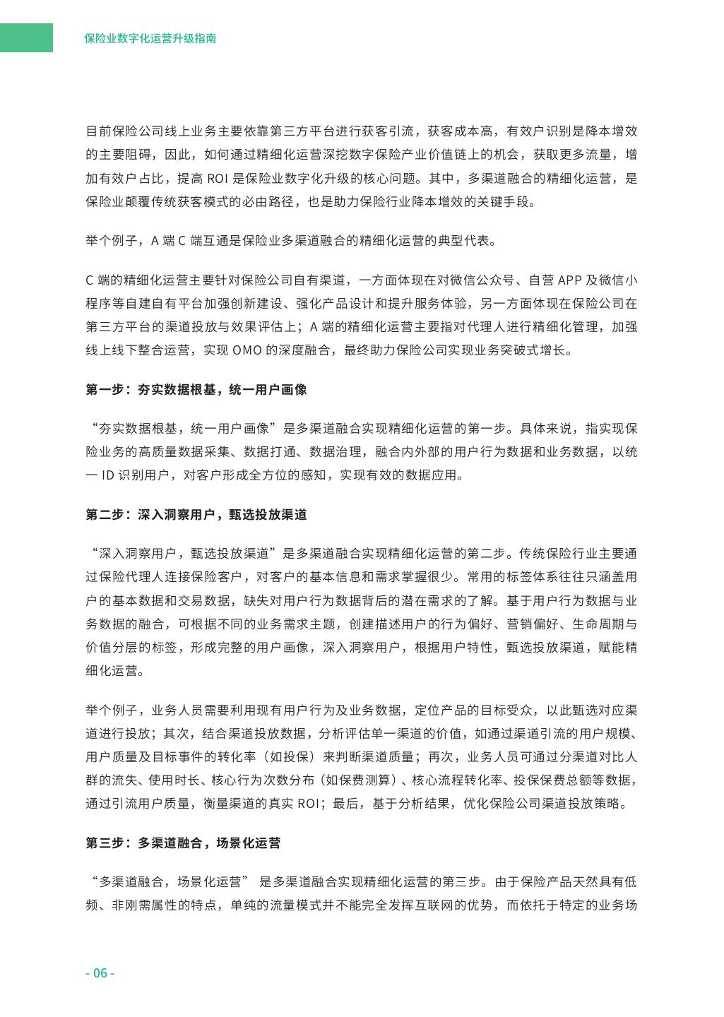 8 .保险业数字化运营升级指南 目前保险公司线上业务主要依靠第三方平台进行获客引流,获客成本高,有效户识别是降本增效 的主要阻碍,因此,如何通过精细化运营深挖数字保险产业价值链上的机会,获取更多流量,增 加有效户占比,提高 ROI 是保险业数字化升级的核心问题。其中,多渠道融合的精细化运营,是 保险业颠覆传统获客模式的必由路径,也是助力保险行业降本增效的关键手段。 举个例子,A 端 C 端互通是保险业多渠道融合的精细化运营的典型代表。 C 端的精细化运营主要针对保险公司自有渠道,一方面体现在对微信公众号、自营 APP 及微信小 程序等自建自有平台加强创新建设、强化产品设计和提升服务体验,另一方面体现在保险公司在 第三方平台的渠道投放与效果评估上;A 端的精细化运营主要指对代理人进行精细化管理,加强 线上线下整合运营,实现 OMO 的深度融合,最终助力保险公司实现业务突破式增长。 第一步:夯实数据根基,统一用户画像 “夯实数据根基,统一用户画像”是多渠道融合实现精细化运营的第一步。具体来说,指实现保 险业务的高质量数据采集、数据打通、数据治理,融合内外部的用户行为数据和业务数据,以统 一 ID 识别用户,对客户形成全方位的感知,实现有效的数据应用。 第二步:深入洞察用户,甄选投放渠道 “深入洞察用户,甄选投放渠道”是多渠道融合实现精细化运营的第二步。传统保险行业主要通 过保险代理人连接保险客户,对客户的基本信息和需求掌握很少。常用的标签体系往往只涵盖用 户的基本数据和交易数据,缺失对用户行为数据背后的潜在需求的了解。基于用户行为数据与业 务数据的融合,可根据不同的业务需求主题,创建描述用户的行为偏好、营销偏好、生命周期与 价值分层的标签,形成完整的用户画像,深入洞察用户,根据用户特性,甄选投放渠道,赋能精 细化运营。 举个例子,业务人员需要利用现有用户行为及业务数据,定位产品的目标受众,以此甄选对应渠 道进行投放;其次,结合渠道投放数据,分析评估单一渠道的价值,如通过渠道引流的用户规模、 用户质量及目标事件的转化率(如投保)来判断渠道质量;再次,业务人员可通过分渠道对比人 群的流失、使用时长、核心行为次数分布(如保费测算)、核心流程转化率、投保保费总额等数据, 通过引流用户质量,衡量渠道的真实 ROI;最后,基于分析结果,优化保险公司渠道投放策略。 第三步:多渠道融合,场景化运营 “多渠道融合,场景化运营” 是多渠道融合实现精细化运营的第三步。由于保险产品天然具有低 频、非刚需属性的特点,单纯的流量模式并不能完全发挥互联网的优势,而依托于特定的业务场 - 06 -