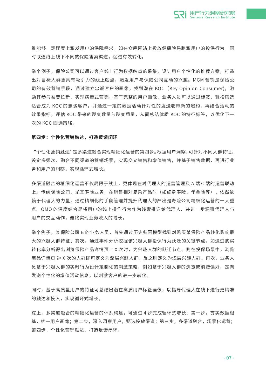 9 .景能够一定程度上激发用户的保障需求,如在众筹网站上投放健康险易刺激用户的投保行为,同 时联通线上线下不同的保险售卖渠道,促进有效转化。 举个例子,保险公司可以通过客户线上行为数据触点的采集,设计用户个性化的推荐方案,打造 出对目标人群更具有吸引力的线上触点,激发用户与保险公司互动的兴趣。MGM 营销是保险公 司的有效营销手段,通过建立忠诚客户的画像,找到潜在 KOC(Key Opinion Consumer),激 励其参与裂变拉新,实现病毒式营销。基于完整的用户画像,业务人员可以通过标签,轻松筛选 适合成为 KOC 的忠诚客户,并通过一定的激励活动针对性的发送老带新的邀约,再结合活动的 效果指标,评估 KOC 带来的裂变数量与裂变质量,从而总结优质 KOC 的特征标签,以优化下一 次的 KOC 圈选策略。 第四步:个性化营销触达,打造反馈闭环 “个性化营销触达”是多渠道融合实现精细化运营的第四步。根据用户洞察,可针对不同人群特征, 设定多频次、融合不同渠道的营销场景,实现交叉销售和增值销售,并基于销售数据,再进行业 务和用户的洞察,实现循环式增长。 多渠道融合的精细化运营不仅局限于线上,更体现在对代理人的运营管理及 A 端 C 端的运营联动 上。传统保险公司,尤其寿险业务,在销售相对复杂产品时(如终身寿险、年金险等),依然依 赖于代理人的力量,通过精细化的手段管理并提升代理人的产出是寿险公司精细化运营的一大重 点。OMO 的深度结合是将用户的线上操作行为作为线索推送给代理人、并进一步洞察代理人与 用户的交互动作,最终实现业务收入的增长。 举个例子,某保险公司 B 的业务人员,首先通过历史归因模型找到对购买某保险产品转化影响最 大的兴趣人群特征;其次,通过事件分析挖掘该兴趣人群投保行为跃迁的关键节点,如通过购买 转化率分析得出浏览保险产品详情页 = X 次时,为兴趣人群的跃迁节点。则在投保场景中,浏览 商品详情页 ≥ X 次的人群即可定义为深层兴趣人群,反之则定义为浅层兴趣人群。再次,业务人 员基于兴趣人群的实时行为设计定制化的刺激策略,例如基于兴趣人群的浏览或消费偏好,定向 发送个性化的增值活动信息,以刺激客户的进一步转化。 同时,基于高质量用户的特征可总结出潜在高质用户标签画像,以指导代理人在线下进行更精准 的触达和投入,实现循环式增长。 综上,多渠道融合的精细化运营的体系构建,可通过 4 步完成循环式增长:第一步,夯实数据根 基,统一用户画像;第二步,深入洞察用户,甄选投放渠道;第三步,多渠道融合,场景化运营; 第四步,个性化营销触达,打造反馈闭环。 - 07 -