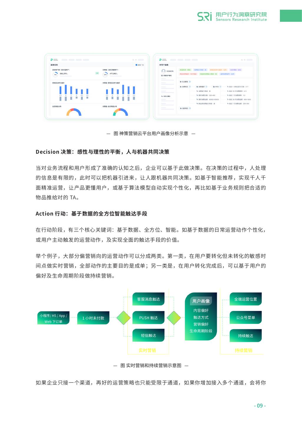 11 . — 图 神策营销云平台用户画像分析示意 — Decision 决策:感性与理性的平衡,人与机器共同决策 当对业务流程和用户形成了准确的认知之后,企业可以基于此做决策。在决策的过程中,人处理 的信息是有限的,此时可以把机器引进来,让人跟机器共同决策。如基于智能推荐,实现千人千 面精准运营,让产品更懂用户,或基于算法模型自动实现个性化,再比如基于业务规则把合适的 物品推给对的 TA。 Action 行动:基于数据的全方位智能触达手段 在行动阶段,有三个核心关键词:基于数据、全方位、智能。如基于数据的日常运营动作个性化, 或用户主动触发的运营动作,及实现全面的触达手段的价值。 举个例子,大部分偏营销向的运营动作可以分成两类。第一类,在用户要转化但未转化的敏感时 间点做实时营销,全部动作的主要目的是成单;另一类是,在用户转化完成后,可以基于用户的 偏好及生命周期阶段做持续营销。 — 图 实时营销和持续营销示意图 — 如果企业只接一个渠道,再好的运营策略也只能受限于通道,如果你增加接入多个通道,会将你 - 09 -