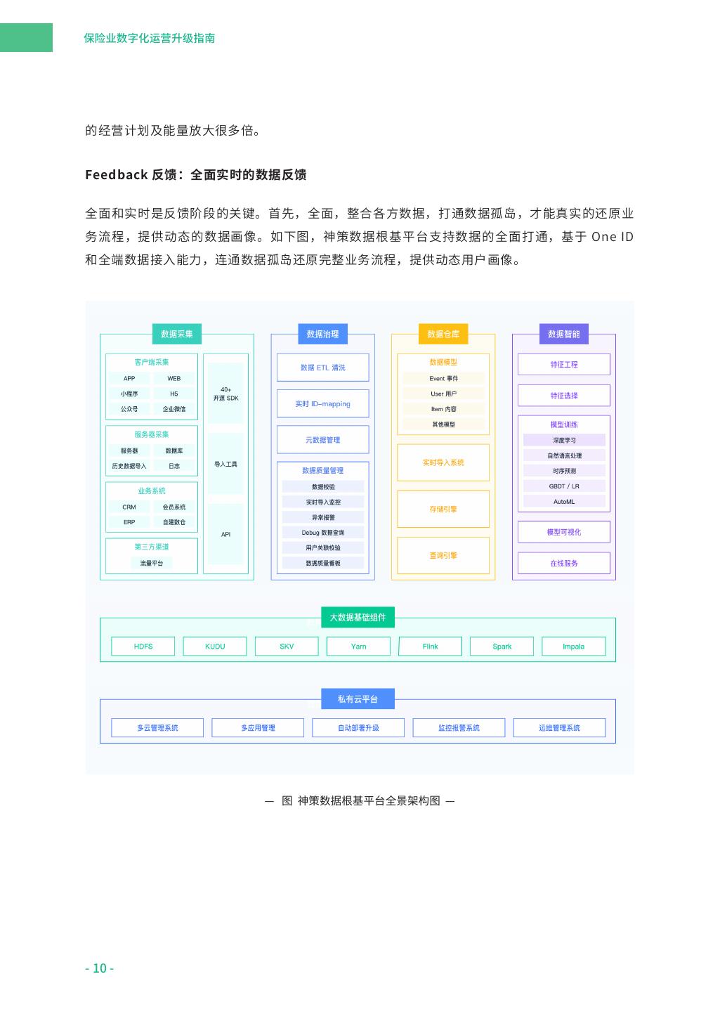 12 .保险业数字化运营升级指南 的经营计划及能量放大很多倍。 Feedback 反馈:全面实时的数据反馈 全面和实时是反馈阶段的关键。首先,全面,整合各方数据,打通数据孤岛,才能真实的还原业 务流程,提供动态的数据画像。如下图,神策数据根基平台支持数据的全面打通,基于 One ID 和全端数据接入能力,连通数据孤岛还原完整业务流程,提供动态用户画像。 — 图 神策数据根基平台全景架构图 — - 10 -