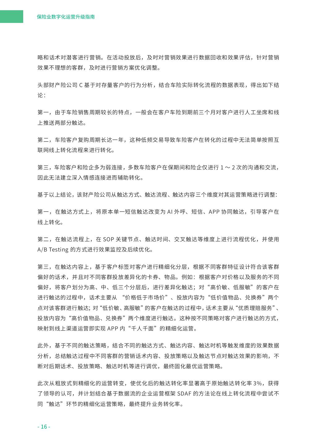 18 .保险业数字化运营升级指南 略和话术对潜客进行营销。在活动投放后,及时对营销效果进行数据回收和效果评估,针对营销 效果不理想的客群,及时进行营销方案优化调整。 头部财产险公司 C 基于对存量客户的行为分析,结合车险实际转化流程的数据表现,得出如下结 论: 第一,由于车险销售周期较长的特点,一般会在客户车险到期前三个月对客户进行人工坐席和线 上推送两部分触达。 第二,车险客户复购周期长达一年,这种低频交易导致车险客户在转化的过程中无法简单按照互 联网线上转化流程来进行转化。 第三,车险客户和险企多为弱连接,多数车险客户在保期间和险企仅进行 1 ~ 2 次的沟通和交流, 因此无法建立深入情感连接进而辅助转化。 基于以上结论,该财产险公司从触达方式、触达流程、触达内容三个维度对其运营策略进行调整: 第一,在触达方式上,将原本单一短信触达改变为 AI 外呼、短信、APP 协同触达,引导客户在 线上转化。 第二,在触达流程上,在 SOP 关键节点、触达时间、交叉触达等维度上进行流程优化,并使用 A/B Testing 的方式进行效果监控及后续优化。 第三,在触达内容上,基于客户标签对客户进行精细化分层,根据不同客群特征设计符合该客群 偏好的话术,并且对不同客群投放差异化的卡券、物品。例如:根据客户对价格以及服务的不同 偏好,将客户划分为高、中、低三个分层后,进行差异化触达;对“高价敏、低服敏”的客户在 进行触达的过程中,话术主要从 “价格低于市场价”、投放内容为“低价值物品、兑换券”两个 点对该客群进行触达;对“低价敏、高服敏”的客户在触达的过程中,话术主要从“优质理赔服务”、 投放内容为“高价值物品、兑换券”两个维度进行触达。这种按不同策略对客户进行触达的方式, 映射到线上渠道运营即实现 APP 内“千人千面”的精细化运营。 此外,基于不同的触达策略,结合不同的触达方式、触达内容、触达时机等触发维度的效果数据 分析,总结触达过程中不同客群的营销话术内容、投放策略以及触达节点对触达效果的影响,不 断对后期话术、投放策略、触达时机等进行调优,最终固化最优运营策略。 此次从粗放式到精细化的运营转变,使优化后的触达转化率显著高于原始触达转化率 3%,获得 了领导的认可,并计划结合基于数据流的企业运营框架 SDAF 的方法论在线上转化流程中尝试不 同“触达”环节的精细化运营策略,最终提升业务转化率。 - 16 -