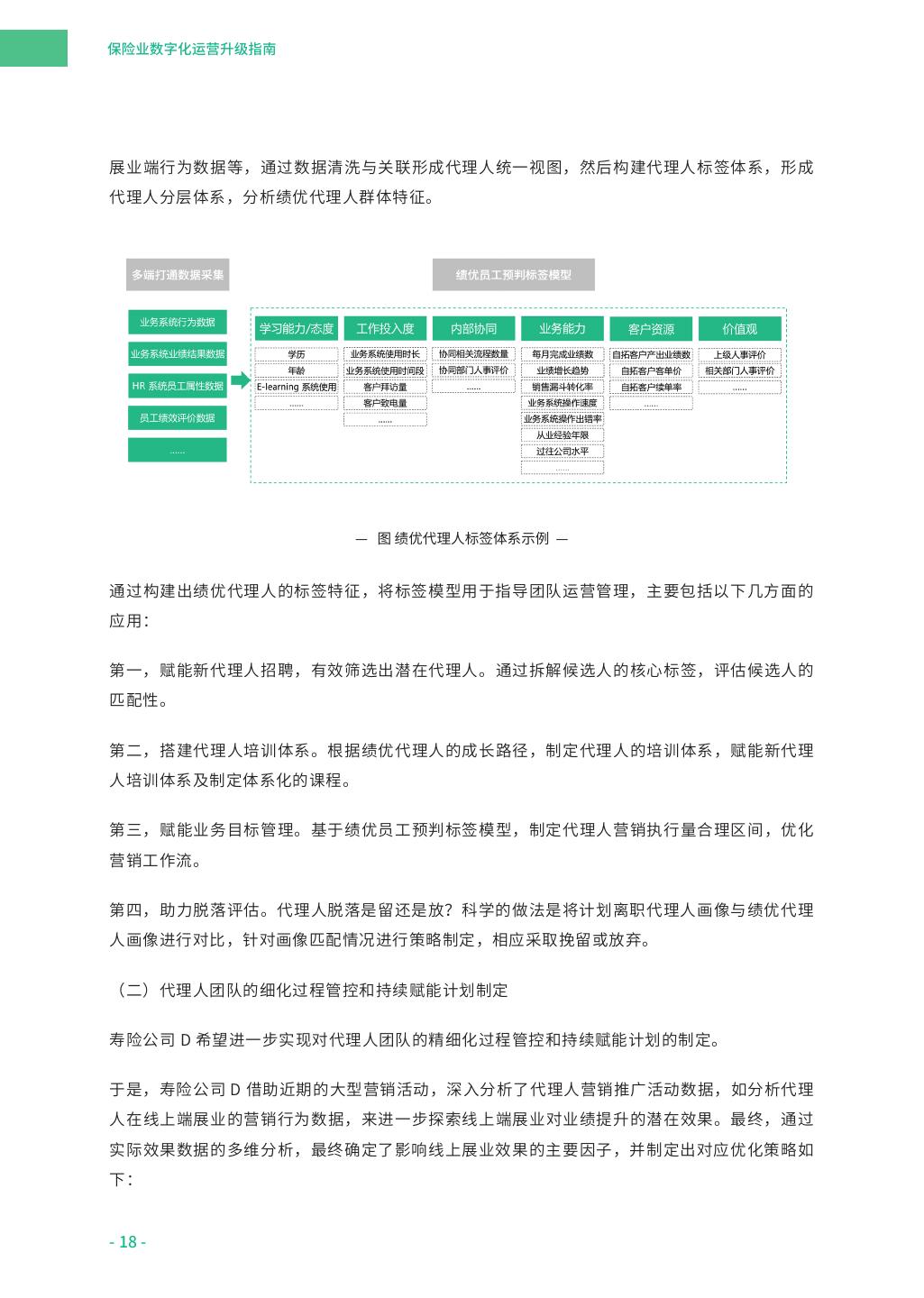 20 .保险业数字化运营升级指南 展业端行为数据等,通过数据清洗与关联形成代理人统一视图,然后构建代理人标签体系,形成 代理人分层体系,分析绩优代理人群体特征。 — 图 绩优代理人标签体系示例 — 通过构建出绩优代理人的标签特征,将标签模型用于指导团队运营管理,主要包括以下几方面的 应用: 第一,赋能新代理人招聘,有效筛选出潜在代理人。通过拆解候选人的核心标签,评估候选人的 匹配性。 第二,搭建代理人培训体系。根据绩优代理人的成长路径,制定代理人的培训体系,赋能新代理 人培训体系及制定体系化的课程。 第三,赋能业务目标管理。基于绩优员工预判标签模型,制定代理人营销执行量合理区间,优化 营销工作流。 第四,助力脱落评估。代理人脱落是留还是放?科学的做法是将计划离职代理人画像与绩优代理 人画像进行对比,针对画像匹配情况进行策略制定,相应采取挽留或放弃。 (二)代理人团队的细化过程管控和持续赋能计划制定 寿险公司 D 希望进一步实现对代理人团队的精细化过程管控和持续赋能计划的制定。 于是,寿险公司 D 借助近期的大型营销活动,深入分析了代理人营销推广活动数据,如分析代理 人在线上端展业的营销行为数据,来进一步探索线上端展业对业绩提升的潜在效果。最终,通过 实际效果数据的多维分析,最终确定了影响线上展业效果的主要因子,并制定出对应优化策略如 下: - 18 -