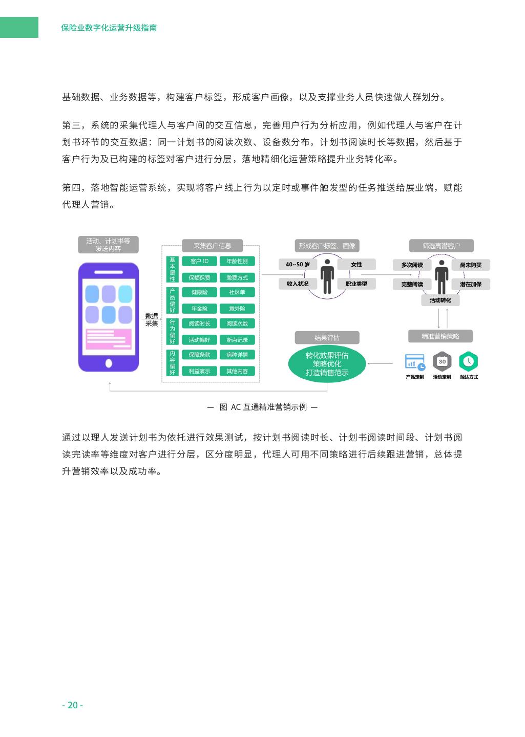 22 .保险业数字化运营升级指南 基础数据、业务数据等,构建客户标签,形成客户画像,以及支撑业务人员快速做人群划分。 第三,系统的采集代理人与客户间的交互信息,完善用户行为分析应用,例如代理人与客户在计 划书环节的交互数据:同一计划书的阅读次数、设备数分布,计划书阅读时长等数据,然后基于 客户行为及已构建的标签对客户进行分层,落地精细化运营策略提升业务转化率。 第四,落地智能运营系统,实现将客户线上行为以定时或事件触发型的任务推送给展业端,赋能 代理人营销。 — 图 AC 互通精准营销示例 — 通过以理人发送计划书为依托进行效果测试,按计划书阅读时长、计划书阅读时间段、计划书阅 读完读率等维度对客户进行分层,区分度明显,代理人可用不同策略进行后续跟进营销,总体提 升营销效率以及成功率。 - 20 -