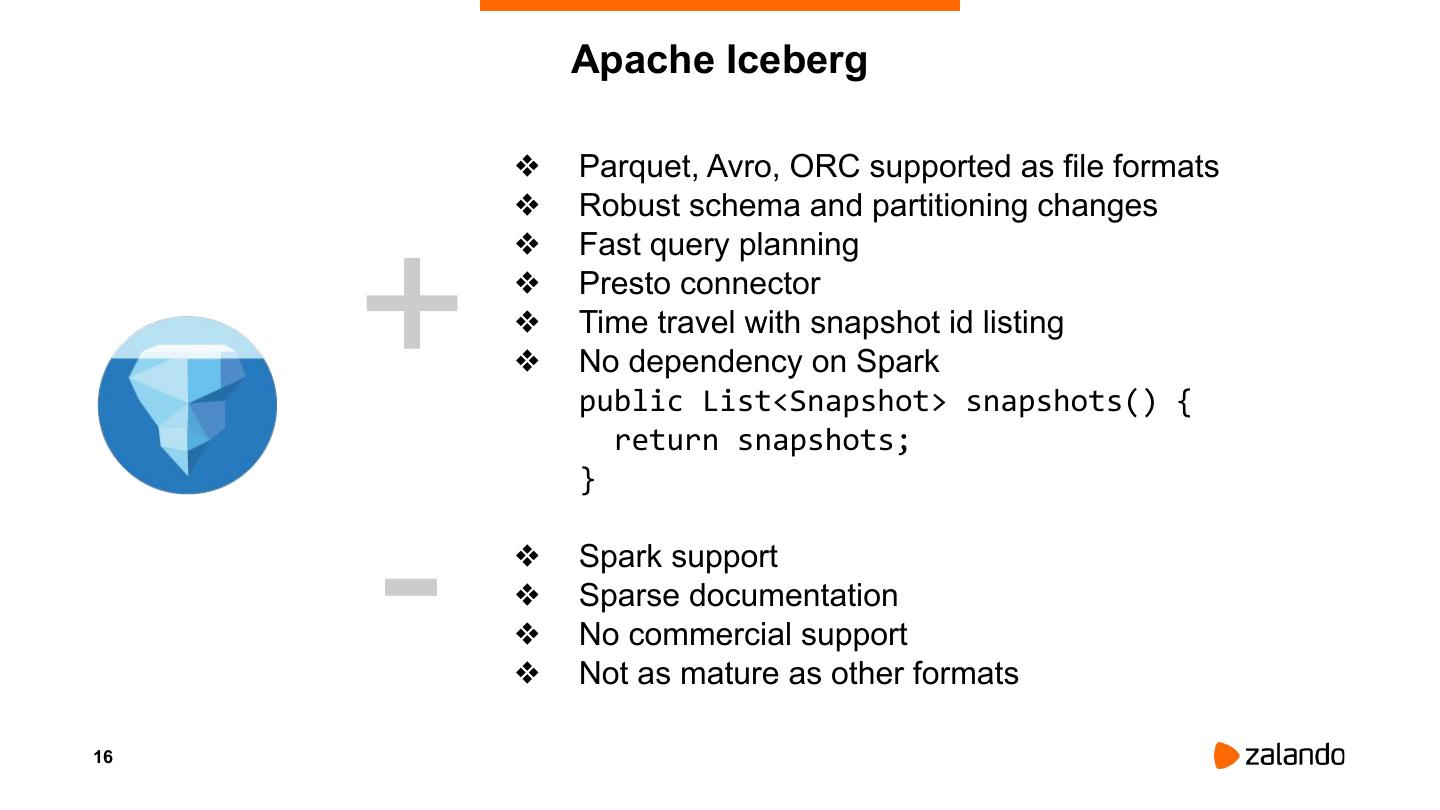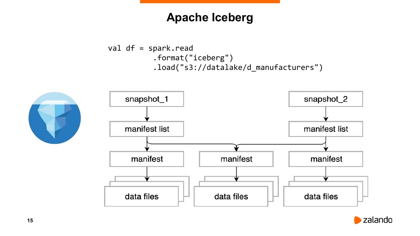 15 . Apache Iceberg val df = spark.read .format("iceberg") .load("s3://datalake/d_manufacturers") 15