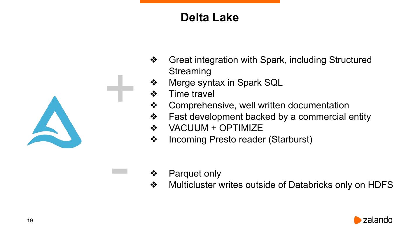 19 . Delta Lake ❖ Great integration with Spark, including Structured + Streaming ❖ Merge syntax in Spark SQL ❖ Time travel ❖ Comprehensive, well written documentation ❖ Fast development backed by a commercial entity ❖ VACUUM + OPTIMIZE ❖ Incoming Presto reader (Starburst) - ❖ ❖ Parquet only Multicluster writes outside of Databricks only on HDFS 19
