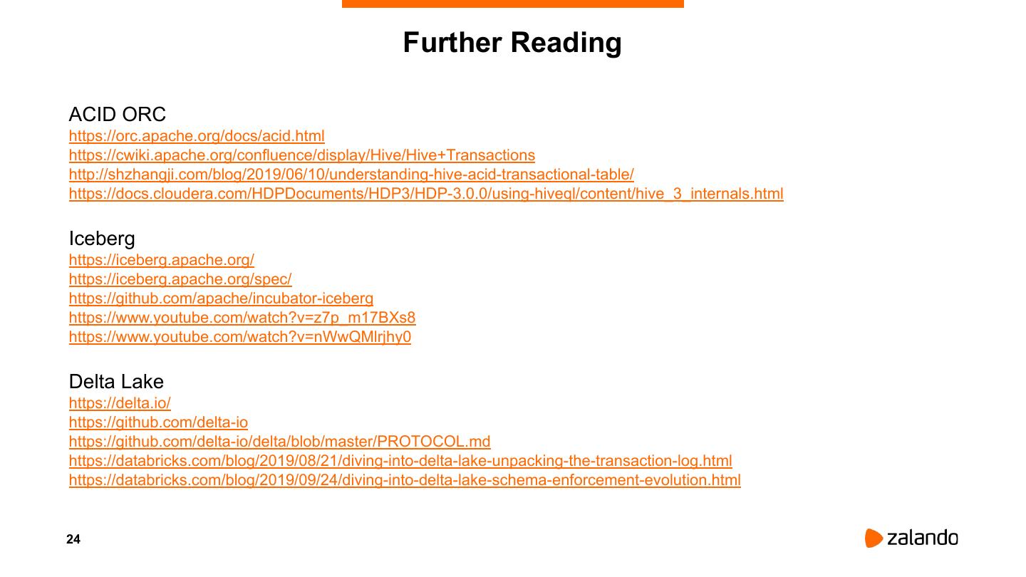 24 . Further Reading ACID ORC https://orc.apache.org/docs/acid.html https://cwiki.apache.org/confluence/display/Hive/Hive+Transactions http://shzhangji.com/blog/2019/06/10/understanding-hive-acid-transactional-table/ https://docs.cloudera.com/HDPDocuments/HDP3/HDP-3.0.0/using-hiveql/content/hive_3_internals.html Iceberg https://iceberg.apache.org/ https://iceberg.apache.org/spec/ https://github.com/apache/incubator-iceberg https://www.youtube.com/watch?v=z7p_m17BXs8 https://www.youtube.com/watch?v=nWwQMlrjhy0 Delta Lake https://delta.io/ https://github.com/delta-io https://github.com/delta-io/delta/blob/master/PROTOCOL.md https://databricks.com/blog/2019/08/21/diving-into-delta-lake-unpacking-the-transaction-log.html https://databricks.com/blog/2019/09/24/diving-into-delta-lake-schema-enforcement-evolution.html 24
