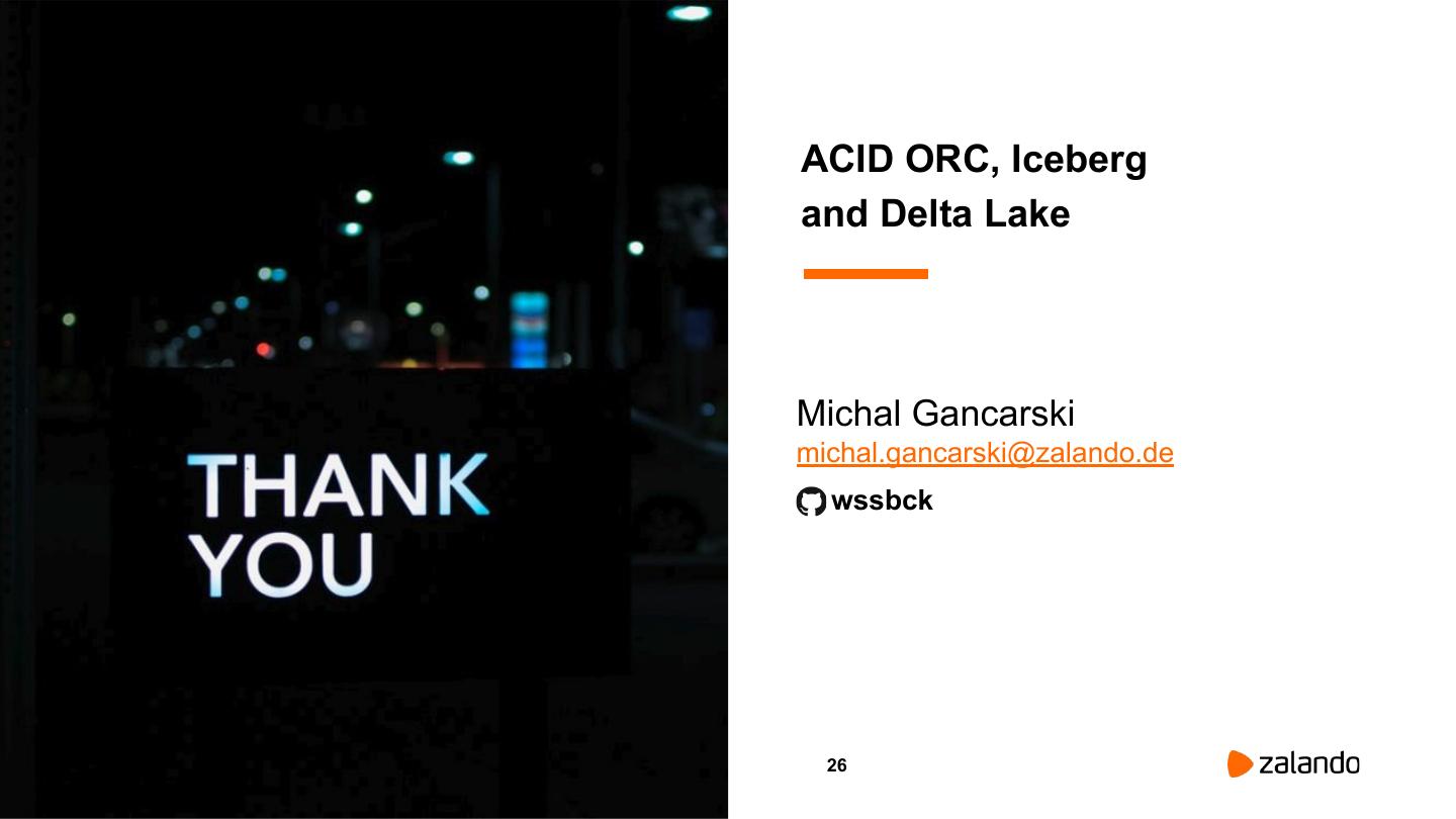 26 .ACID ORC, Iceberg and Delta Lake Michal Gancarski michal.gancarski@zalando.de wssbck 26