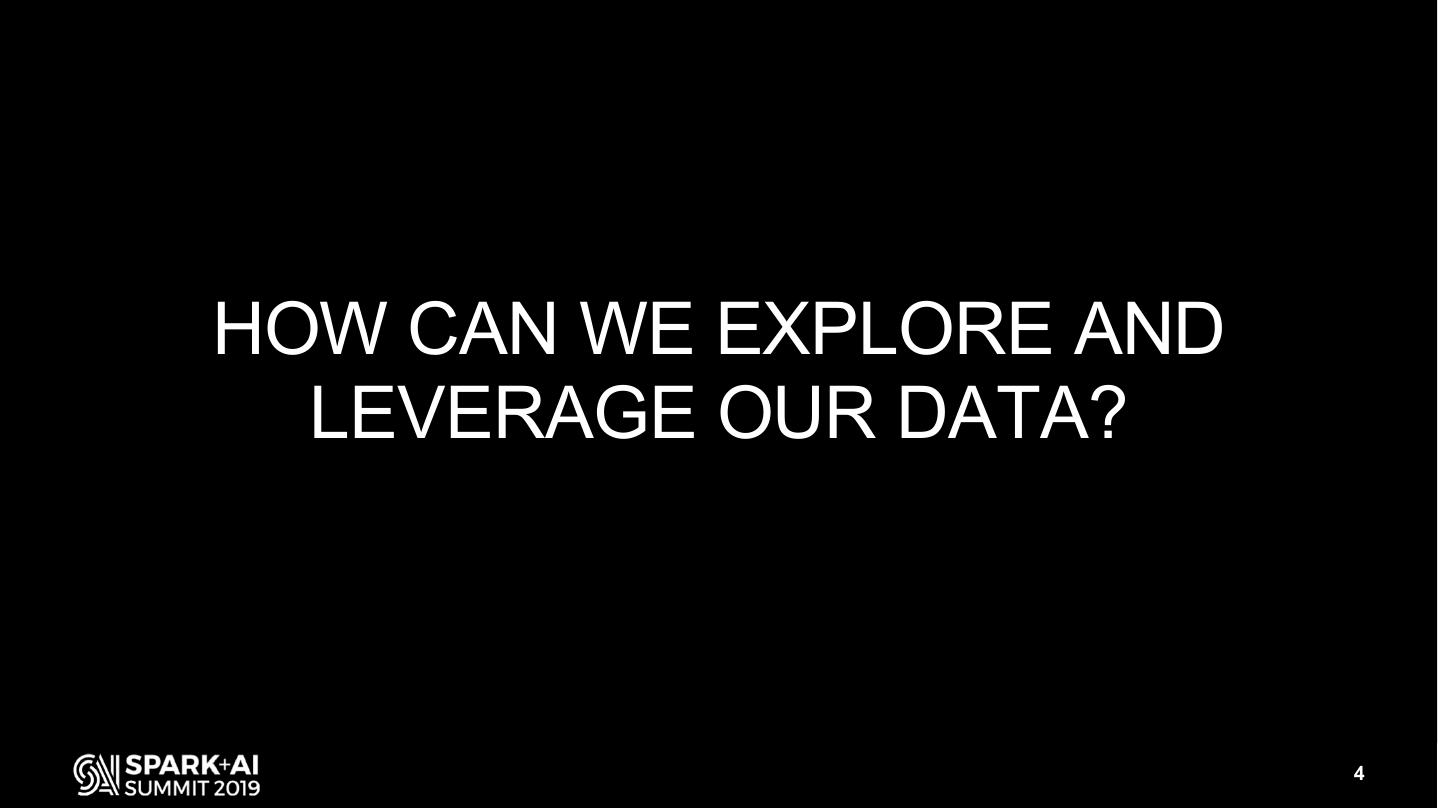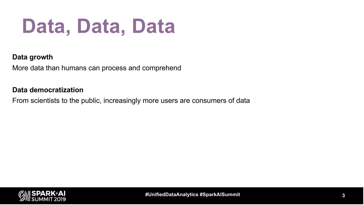 3 . Data, Data, Data Data growth More data than humans can process and comprehend Data democratization From scientists to the public, increasingly more users are consumers of data #UnifiedDataAnalytics #SparkAISummit 3