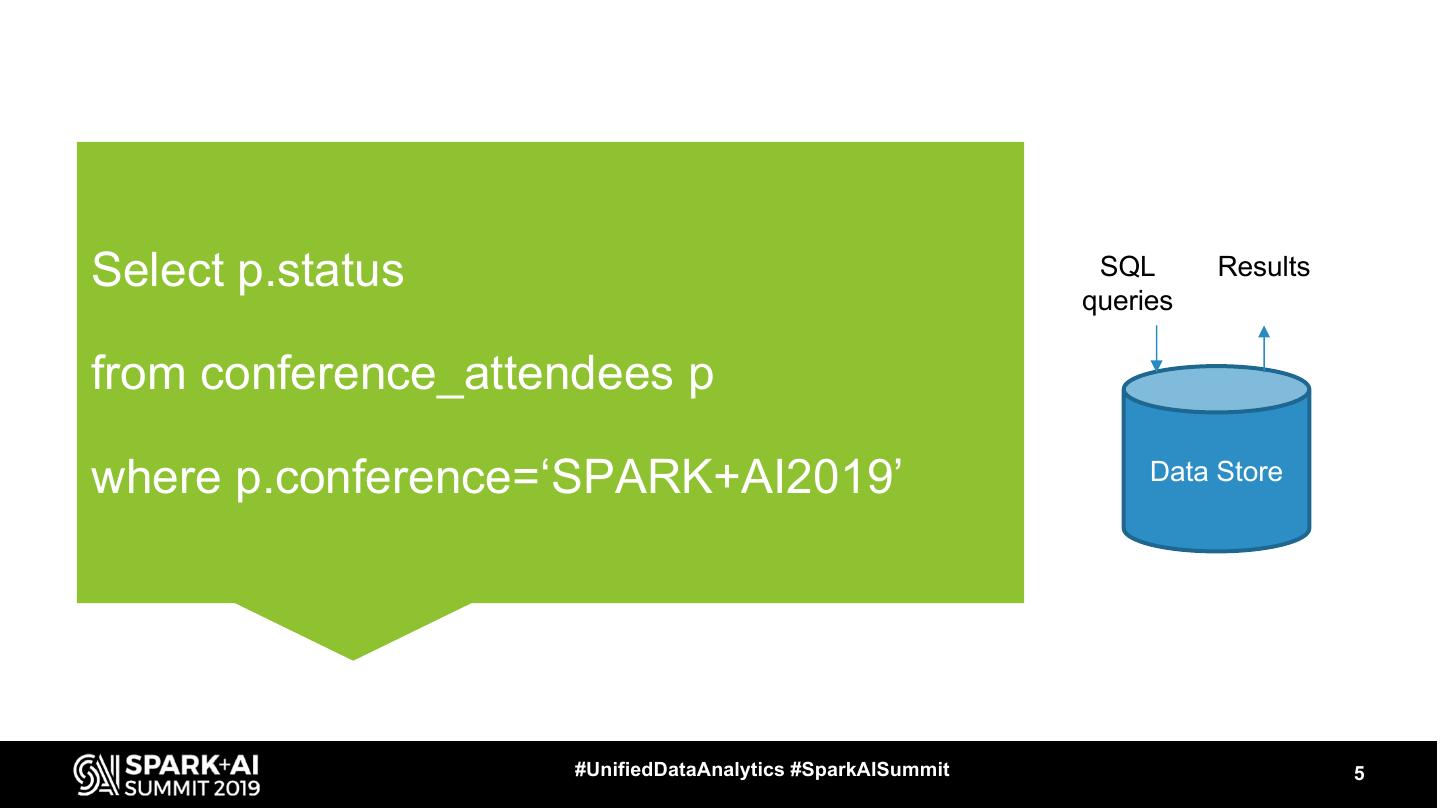 5 .Select p.status SQL Results queries from conference_attendees p where p.conference=‘SPARK+AI2019’ Data Store #UnifiedDataAnalytics #SparkAISummit 5