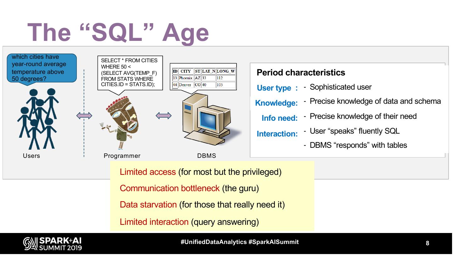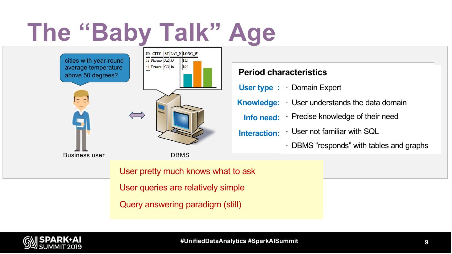 8 . The “SQL” Age which cities have SELECT * FROM CITIES year-round average WHERE 50 < temperature above (SELECT AVG(TEMP_F) Period characteristics 50 degrees? FROM STATS WHERE CITIES.ID = STATS.ID); User type : - Sophisticated user Knowledge: - Precise knowledge of data and schema Info need: - Precise knowledge of their need Interaction: - User “speaks” fluently SQL - DBMS “responds” with tables Users Programmer DBMS Limited access (for most but the privileged) Communication bottleneck (the guru) Data starvation (for those that really need it) Limited interaction (query answering) #UnifiedDataAnalytics #SparkAISummit 8