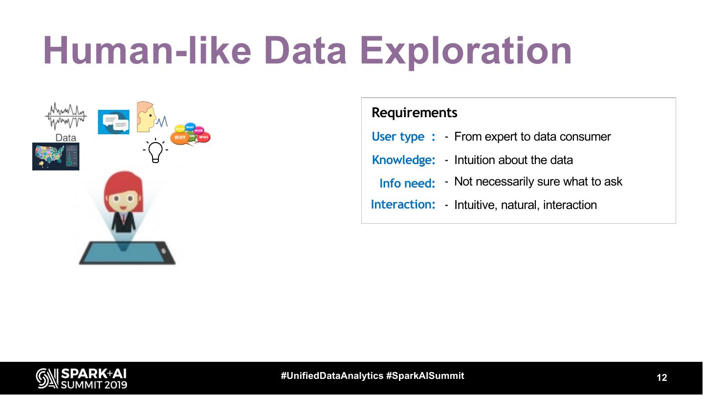 12 .Human-like Data Exploration Requirements User type : - From expert to data consumer Knowledge: - Intuition about the data Info need: - Not necessarily sure what to ask Interaction: - Intuitive, natural, interaction #UnifiedDataAnalytics #SparkAISummit 12