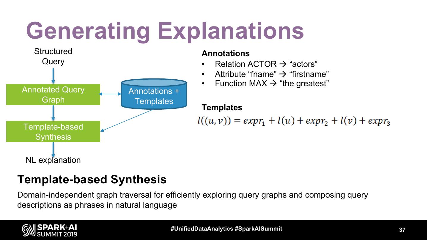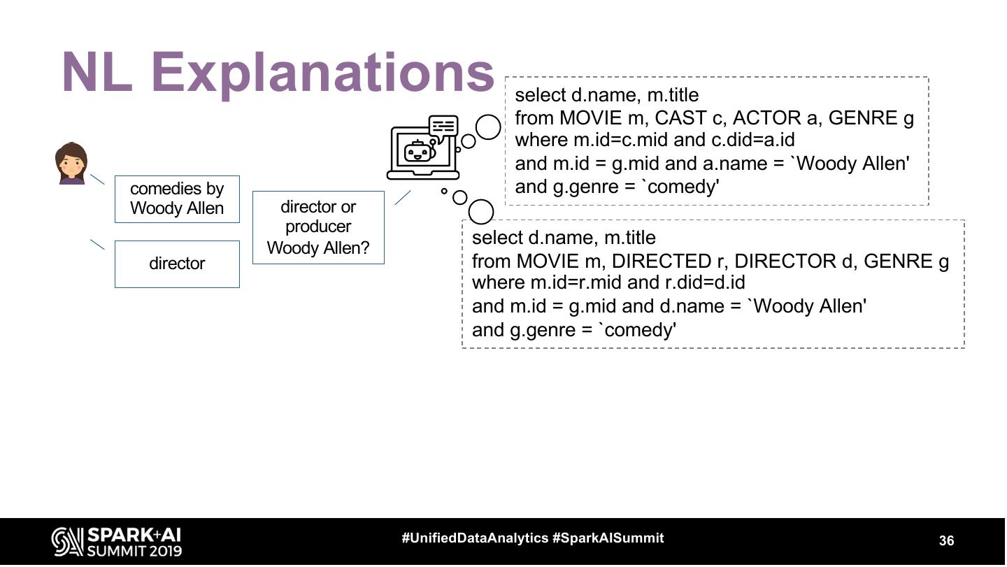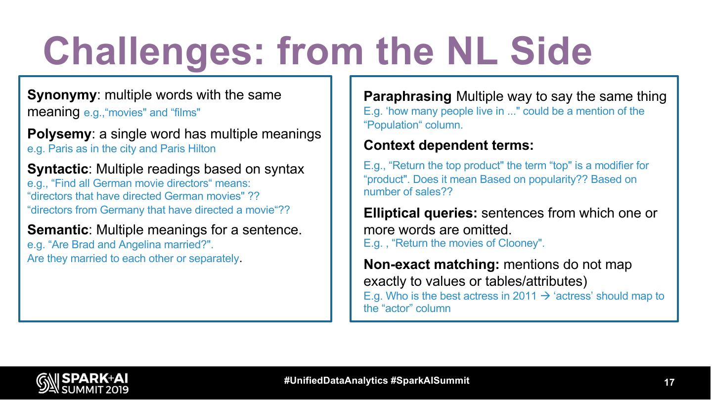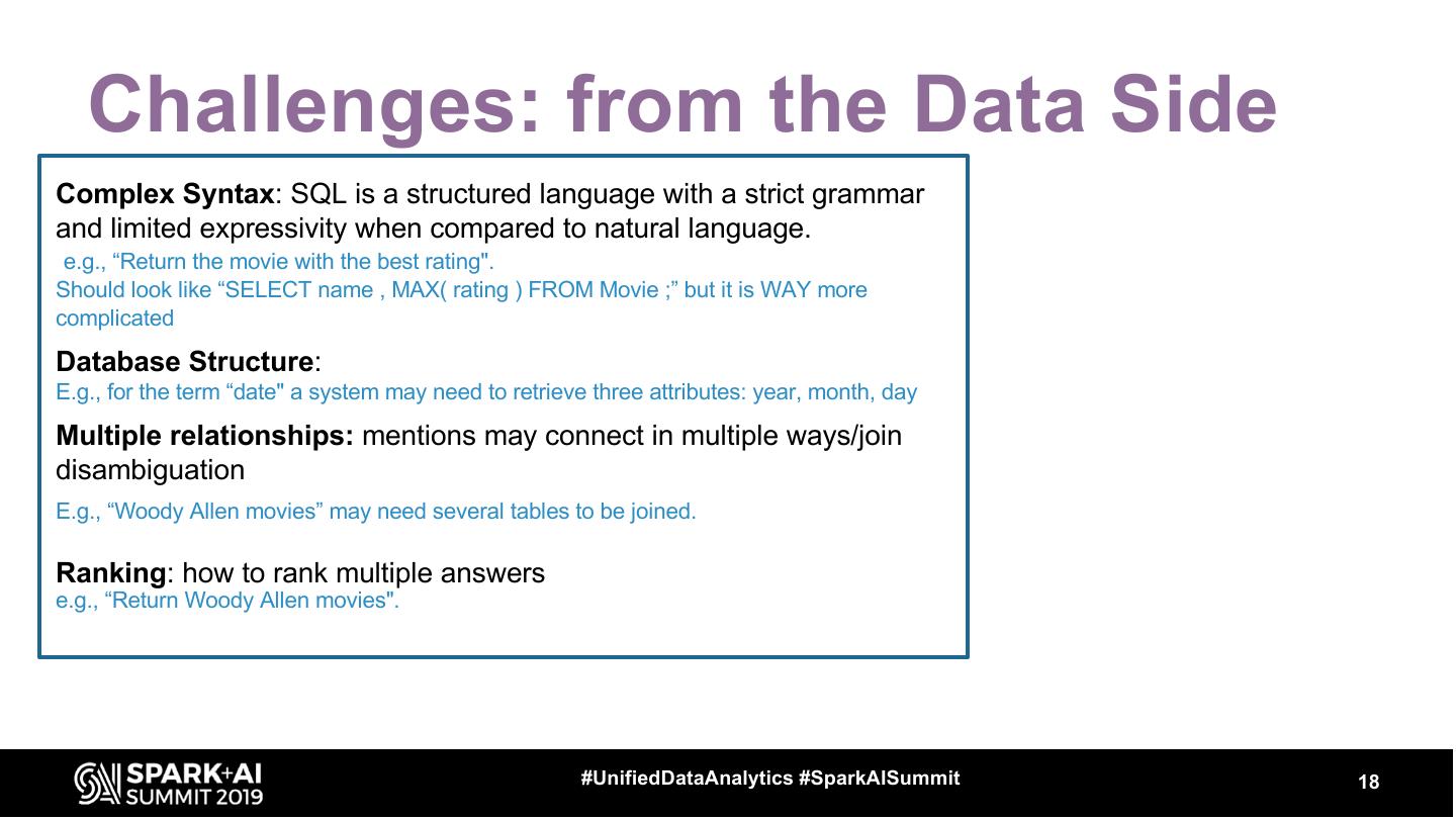 18 . Challenges: from the Data Side Complex Syntax: SQL is a structured language with a strict grammar and limited expressivity when compared to natural language. e.g., “Return the movie with the best rating". Should look like “SELECT name , MAX( rating ) FROM Movie ;” but it is WAY more complicated Database Structure: E.g., for the term “date" a system may need to retrieve three attributes: year, month, day Multiple relationships: mentions may connect in multiple ways/join disambiguation E.g., “Woody Allen movies” may need several tables to be joined. Ranking: how to rank multiple answers e.g., “Return Woody Allen movies". #UnifiedDataAnalytics #SparkAISummit 18