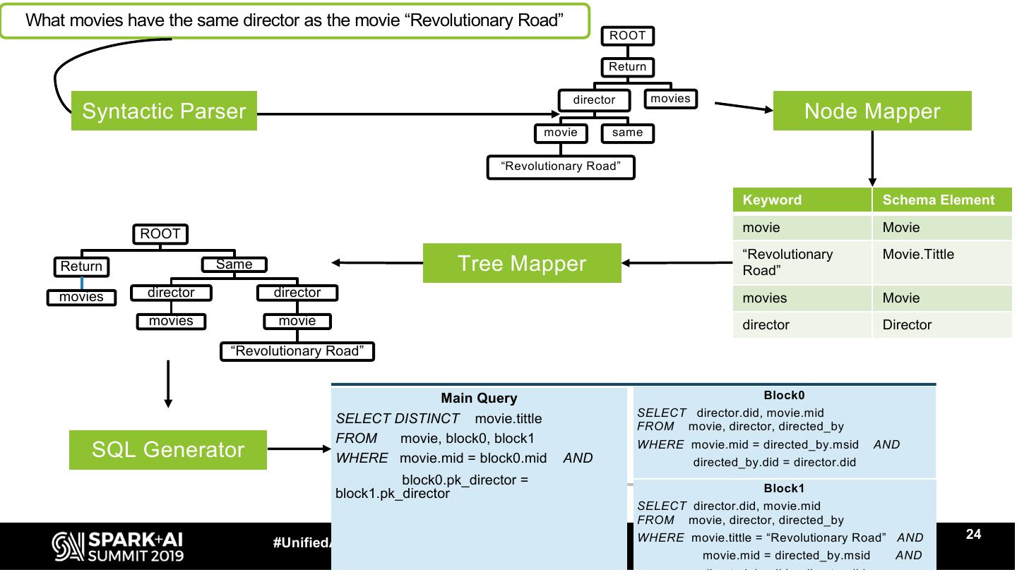 24 .What movies have the same director as the movie “Revolutionary Road” ROOT Return director movies Syntactic Parser Node Mapper movie same “Revolutionary Road” Keyword Schema Element ROOT movie Movie “Revolutionary Movie.Tittle Return Same Tree Mapper Road” movies director director movies Movie movies movie director Director “Revolutionary Road” Main Query Block0 SELECT director.did, movie.mid SELECT DISTINCT movie.tittle FROM movie, director, directed_by FROM movie, block0, block1 SQL Generator WHERE movie.mid = block0.mid AND WHERE movie.mid = directed_by.msid directed_by.did = director.did AND block0.pk_director = block1.pk_director Block1 SELECT director.did, movie.mid FROM movie, director, directed_by WHERE movie.tittle = “Revolutionary Road” AND 24 #UnifiedAnalytics #SparkAISummit movie.mid = directed_by.msid AND
