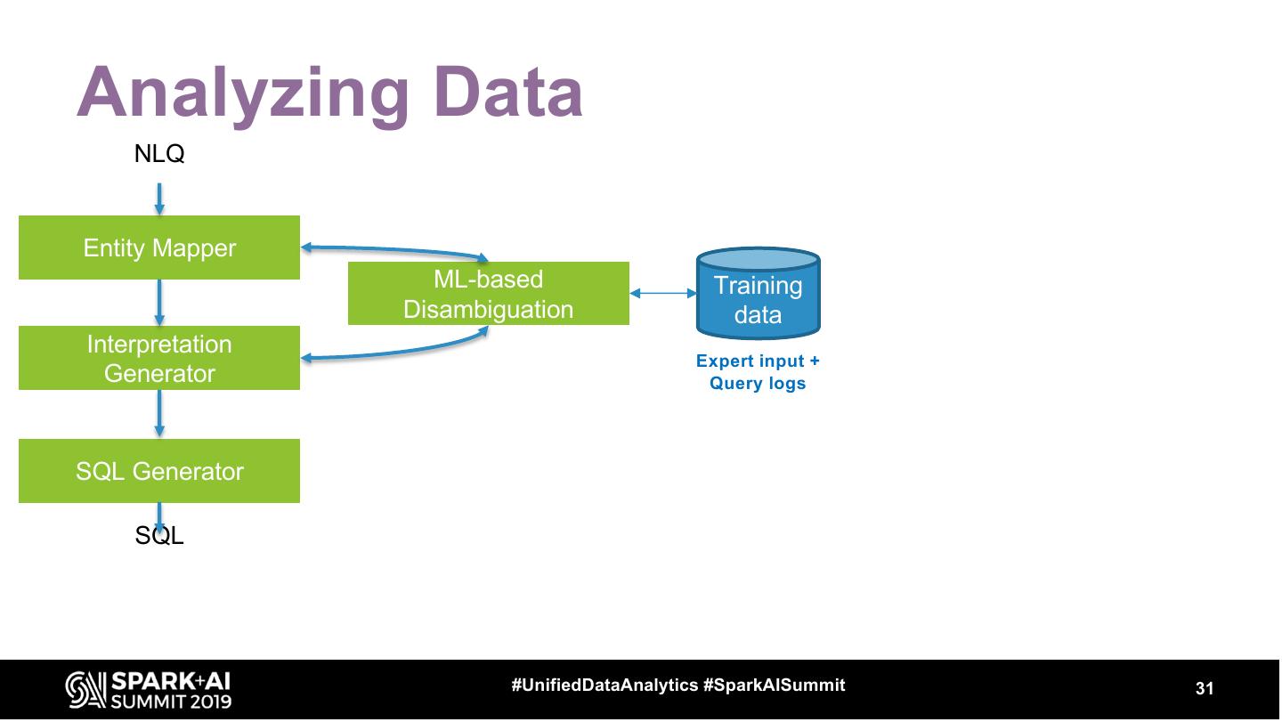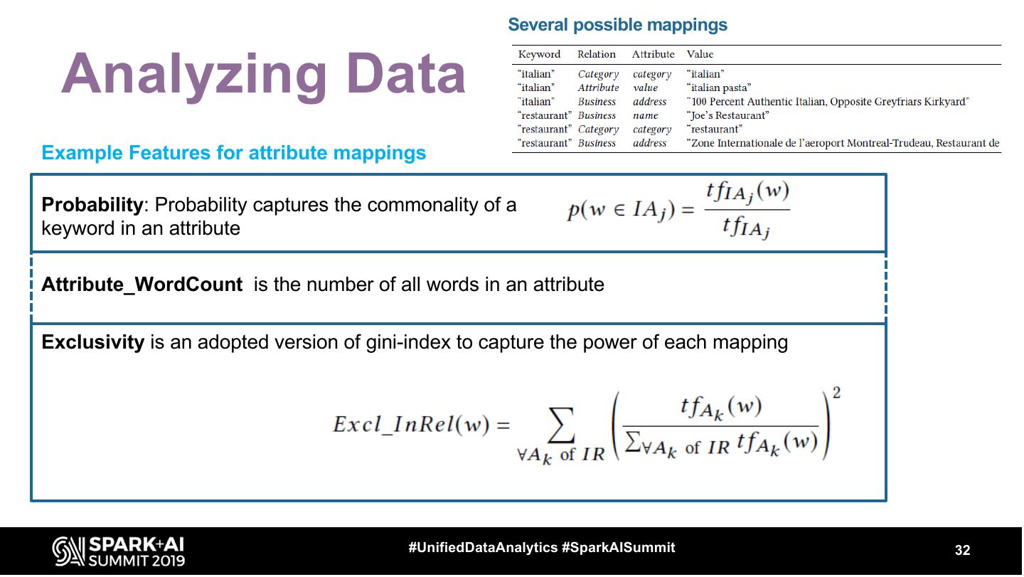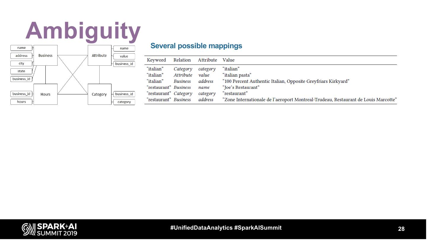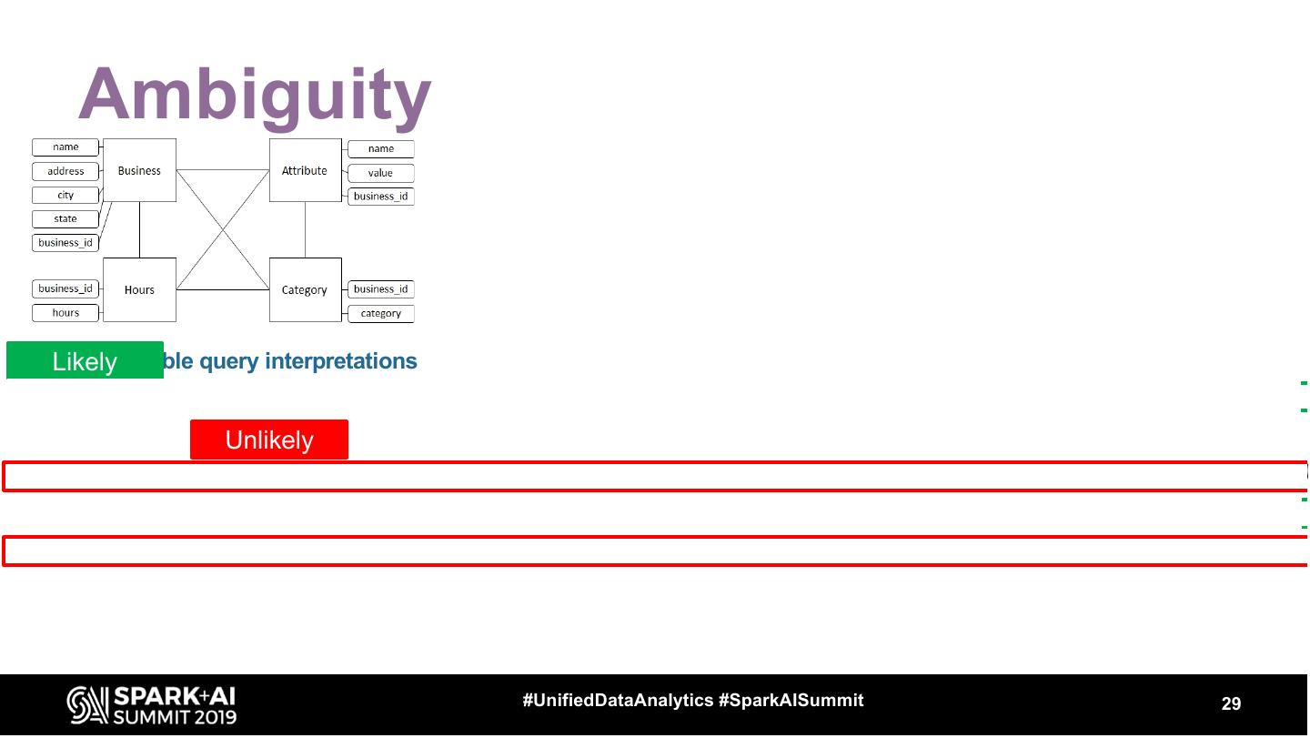 29 . Ambiguity Likely Several possible query interpretations 1 "business categorized as restaurant and as Italian” “restaurant''= Category(category), "italian''= Category(category) 2 "business categorized as Italian whose name includes restaurant” Unlikely "restaurant''= Business(name), "italian''= Category(category) 3 "business categorized as Italian whose address includes restaurant” "restaurant''= Business(address), "italian''= Category(category) 4 "business categorized as restaurant that serves Italian” "restaurant''= Category(category), "italian''= Attribute(value) 5 "business whose address contains restaurant and Italian” "restaurant''= Business(address), "italian''= Business(address) #UnifiedDataAnalytics #SparkAISummit 29