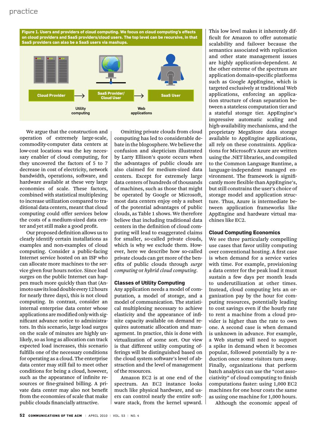 3 .practice Figure 1. Users and providers of cloud computing. We focus on cloud computing’s effects This low level makes it inherently dif- on cloud providers and SaaS providers/cloud users. The top level can be recursive, in that ficult for Amazon to offer automatic SaaS providers can also be a SaaS users via mashups. scalability and failover because the semantics associated with replication and other state management issues are highly application-dependent. At the other extreme of the spectrum are application domain-specific platforms such as Google AppEngine, which is targeted exclusively at traditional Web SaaS Provider/ applications, enforcing an applica- Cloud Provider SaaS User Cloud User tion structure of clean separation be- Utility Web tween a stateless computation tier and computing applications a stateful storage tier. AppEngine’s impressive automatic scaling and high-availability mechanisms, and the We argue that the construction and Omitting private clouds from cloud proprietary MegaStore data storage operation of extremely large-scale, computing has led to considerable de- available to AppEngine applications, commodity-computer data centers at bate in the blogosphere. We believe the all rely on these constraints. Applica- low-cost locations was the key neces- confusion and skepticism illustrated tions for Microsoft’s Azure are written sary enabler of cloud computing, for by Larry Ellison’s quote occurs when using the .NET libraries, and compiled they uncovered the factors of 5 to 7 the advantages of public clouds are to the Common Language Runtime, a decrease in cost of electricity, network also claimed for medium-sized data language-independent managed en- bandwidth, operations, software, and centers. Except for extremely large vironment. The framework is signifi- hardware available at these very large data centers of hundreds of thousands cantly more flexible than AppEngine’s, economies of scale. These factors, of machines, such as those that might but still constrains the user’s choice of combined with statistical multiplexing be operated by Google or Microsoft, storage model and application struc- to increase utilization compared to tra- most data centers enjoy only a subset ture. Thus, Azure is intermediate be- ditional data centers, meant that cloud of the potential advantages of public tween application frameworks like computing could offer services below clouds, as Table 1 shows. We therefore AppEngine and hardware virtual ma- the costs of a medium-sized data cen- believe that including traditional data chines like EC2. ter and yet still make a good profit. centers in the definition of cloud com- Our proposed definition allows us to puting will lead to exaggerated claims Cloud Computing Economics clearly identify certain installations as for smaller, so-called private clouds, We see three particularly compelling examples and non-examples of cloud which is why we exclude them. How- use cases that favor utility computing computing. Consider a public-facing ever, here we describe how so-called over conventional hosting. A first case Internet service hosted on an ISP who private clouds can get more of the ben- is when demand for a service varies can allocate more machines to the ser- efits of public clouds through surge with time. For example, provisioning vice given four hours notice. Since load computing or hybrid cloud computing. a data center for the peak load it must surges on the public Internet can hap- sustain a few days per month leads pen much more quickly than that (An- Classes of Utility Computing to underutilization at other times. imoto saw its load double every 12 hours Any application needs a model of com- Instead, cloud computing lets an or- for nearly three days), this is not cloud putation, a model of storage, and a ganization pay by the hour for com- computing. In contrast, consider an model of communication. The statisti- puting resources, potentially leading internal enterprise data center whose cal multiplexing necessary to achieve to cost savings even if the hourly rate applications are modified only with sig- elasticity and the appearance of infi- to rent a machine from a cloud pro- nificant advance notice to administra- nite capacity available on demand re- vider is higher than the rate to own tors. In this scenario, large load surges quires automatic allocation and man- one. A second case is when demand on the scale of minutes are highly un- agement. In practice, this is done with is unknown in advance. For example, likely, so as long as allocation can track virtualization of some sort. Our view a Web startup will need to support expected load increases, this scenario is that different utility computing of- a spike in demand when it becomes fulfills one of the necessary conditions ferings will be distinguished based on popular, followed potentially by a re- for operating as a cloud. The enterprise the cloud system software’s level of ab- duction once some visitors turn away. data center may still fail to meet other straction and the level of management Finally, organizations that perform conditions for being a cloud, however, of the resources. batch analytics can use the “cost asso- such as the appearance of infinite re- Amazon EC2 is at one end of the ciativity” of cloud computing to finish sources or fine-grained billing. A pri- spectrum. An EC2 instance looks computations faster: using 1,000 EC2 vate data center may also not benefit much like physical hardware, and us- machines for one hour costs the same from the economies of scale that make ers can control nearly the entire soft- as using one machine for 1,000 hours. public clouds financially attractive. ware stack, from the kernel upward. Although the economic appeal of 52 comm unicatio ns o f th e acm | apr i l 201 0 | vol. 5 3 | no. 4