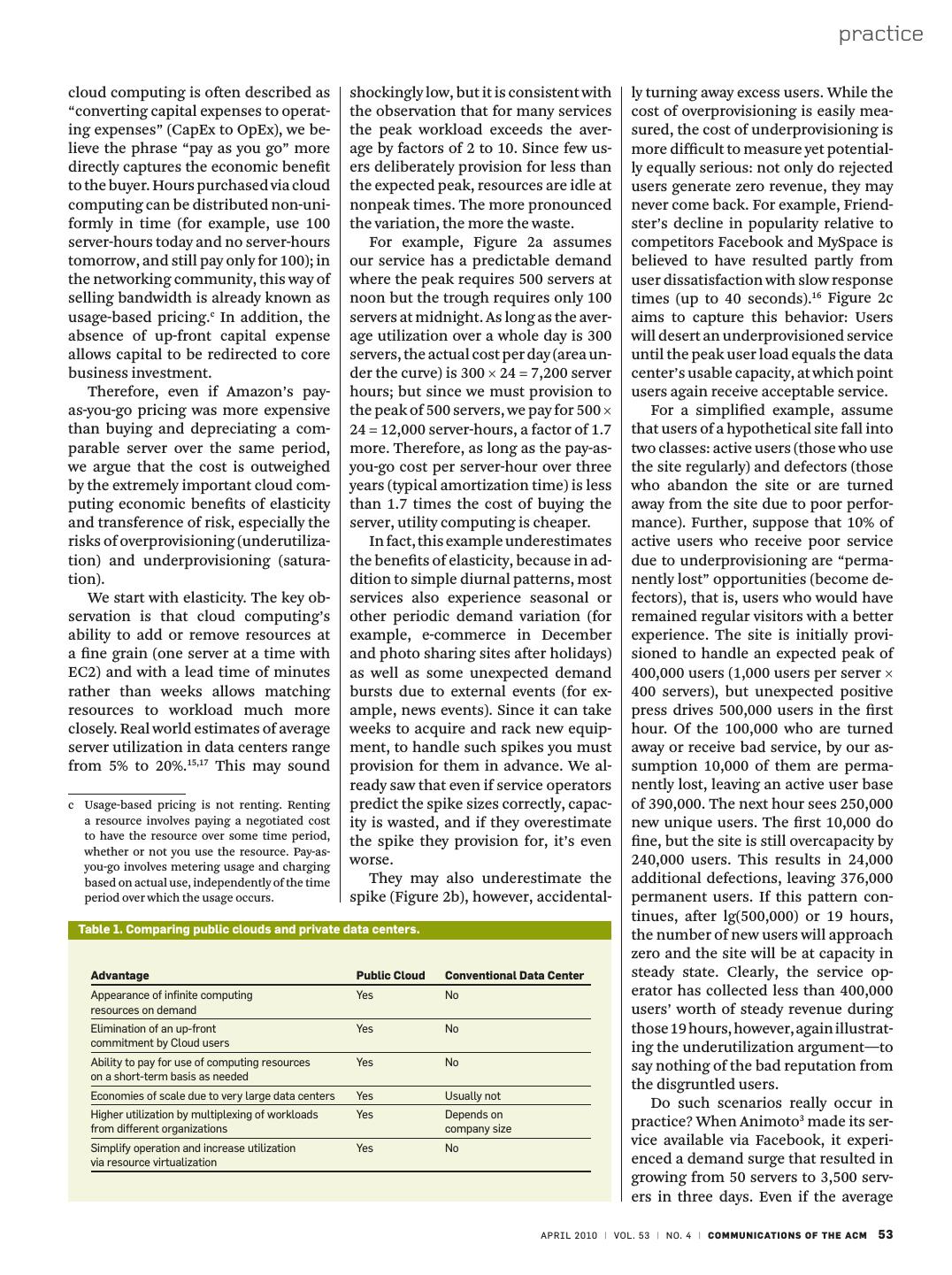 4 . practice cloud computing is often described as shockingly low, but it is consistent with ly turning away excess users. While the “converting capital expenses to operat- the observation that for many services cost of overprovisioning is easily mea- ing expenses” (CapEx to OpEx), we be- the peak workload exceeds the aver- sured, the cost of underprovisioning is lieve the phrase “pay as you go” more age by factors of 2 to 10. Since few us- more difficult to measure yet potential- directly captures the economic benefit ers deliberately provision for less than ly equally serious: not only do rejected to the buyer. Hours purchased via cloud the expected peak, resources are idle at users generate zero revenue, they may computing can be distributed non-uni- nonpeak times. The more pronounced never come back. For example, Friend- formly in time (for example, use 100 the variation, the more the waste. ster’s decline in popularity relative to server-hours today and no server-hours For example, Figure 2a assumes competitors Facebook and MySpace is tomorrow, and still pay only for 100); in our service has a predictable demand believed to have resulted partly from the networking community, this way of where the peak requires 500 servers at user dissatisfaction with slow response selling bandwidth is already known as noon but the trough requires only 100 times (up to 40 seconds).16 Figure 2c usage-based pricing.c In addition, the servers at midnight. As long as the aver- aims to capture this behavior: Users absence of up-front capital expense age utilization over a whole day is 300 will desert an underprovisioned service allows capital to be redirected to core servers, the actual cost per day (area un- until the peak user load equals the data business investment. der the curve) is 300 × 24 = 7,200 server center’s usable capacity, at which point Therefore, even if Amazon’s pay- hours; but since we must provision to users again receive acceptable service. as-you-go pricing was more expensive the peak of 500 servers, we pay for 500 × For a simplified example, assume than buying and depreciating a com- 24 = 12,000 server-hours, a factor of 1.7 that users of a hypothetical site fall into parable server over the same period, more. Therefore, as long as the pay-as- two classes: active users (those who use we argue that the cost is outweighed you-go cost per server-hour over three the site regularly) and defectors (those by the extremely important cloud com- years (typical amortization time) is less who abandon the site or are turned puting economic benefits of elasticity than 1.7 times the cost of buying the away from the site due to poor perfor- and transference of risk, especially the server, utility computing is cheaper. mance). Further, suppose that 10% of risks of overprovisioning (underutiliza- In fact, this example underestimates active users who receive poor service tion) and underprovisioning (satura- the benefits of elasticity, because in ad- due to underprovisioning are “perma- tion). dition to simple diurnal patterns, most nently lost” opportunities (become de- We start with elasticity. The key ob- services also experience seasonal or fectors), that is, users who would have servation is that cloud computing’s other periodic demand variation (for remained regular visitors with a better ability to add or remove resources at example, e-commerce in December experience. The site is initially provi- a fine grain (one server at a time with and photo sharing sites after holidays) sioned to handle an expected peak of EC2) and with a lead time of minutes as well as some unexpected demand 400,000 users (1,000 users per server × rather than weeks allows matching bursts due to external events (for ex- 400 servers), but unexpected positive resources to workload much more ample, news events). Since it can take press drives 500,000 users in the first closely. Real world estimates of average weeks to acquire and rack new equip- hour. Of the 100,000 who are turned server utilization in data centers range ment, to handle such spikes you must away or receive bad service, by our as- from 5% to 20%.15,17 This may sound provision for them in advance. We al- sumption 10,000 of them are perma- ready saw that even if service operators nently lost, leaving an active user base c Usage-based pricing is not renting. Renting predict the spike sizes correctly, capac- of 390,000. The next hour sees 250,000 a resource involves paying a negotiated cost ity is wasted, and if they overestimate new unique users. The first 10,000 do to have the resource over some time period, the spike they provision for, it’s even fine, but the site is still overcapacity by whether or not you use the resource. Pay-as- you-go involves metering usage and charging worse. 240,000 users. This results in 24,000 based on actual use, independently of the time They may also underestimate the additional defections, leaving 376,000 period over which the usage occurs. spike (Figure 2b), however, accidental- permanent users. If this pattern con- tinues, after lg(500,000) or 19 hours, Table 1. Comparing public clouds and private data centers. the number of new users will approach zero and the site will be at capacity in Advantage Public Cloud Conventional Data Center steady state. Clearly, the service op- Appearance of infinite computing Yes No erator has collected less than 400,000 resources on demand users’ worth of steady revenue during Elimination of an up-front Yes No those 19 hours, however, again illustrat- commitment by Cloud users ing the underutilization argument—to Ability to pay for use of computing resources Yes No say nothing of the bad reputation from on a short-term basis as needed the disgruntled users. Economies of scale due to very large data centers Yes Usually not Do such scenarios really occur in Higher utilization by multiplexing of workloads Yes Depends on from different organizations company size practice? W