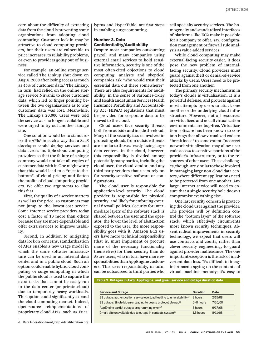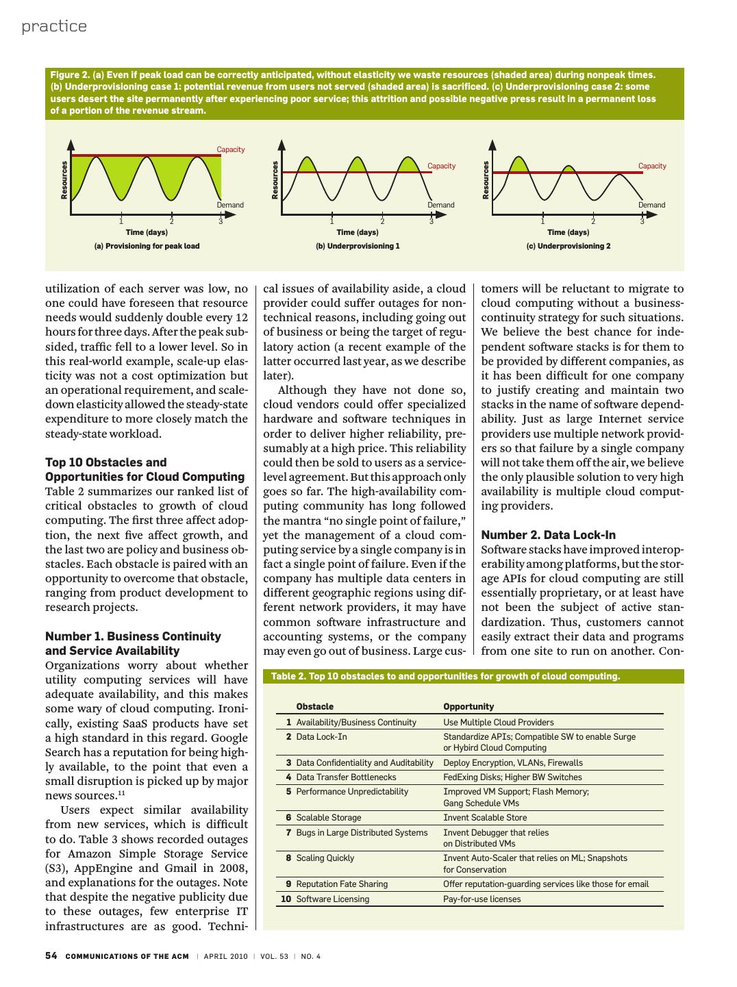 5 .practice Figure 2. (a) Even if peak load can be correctly anticipated, without elasticity we waste resources (shaded area) during nonpeak times. (b) Underprovisioning case 1: potential revenue from users not served (shaded area) is sacrificed. (c) Underprovisioning case 2: some users desert the site permanently after experiencing poor service; this attrition and possible negative press result in a permanent loss of a portion of the revenue stream. Capacity Resources Resources Resources Capacity Capacity Demand Demand Demand 1 2 3 1 2 3 1 2 3 Time (days) Time (days) Time (days) (a) Provisioning for peak load (b) Underprovisioning 1 (c) Underprovisioning 2 utilization of each server was low, no cal issues of availability aside, a cloud tomers will be reluctant to migrate to one could have foreseen that resource provider could suffer outages for non- cloud computing without a business- needs would suddenly double every 12 technical reasons, including going out continuity strategy for such situations. hours for three days. After the peak sub- of business or being the target of regu- We believe the best chance for inde- sided, traffic fell to a lower level. So in latory action (a recent example of the pendent software stacks is for them to this real-world example, scale-up elas- latter occurred last year, as we describe be provided by different companies, as ticity was not a cost optimization but later). it has been difficult for one company an operational requirement, and scale- Although they have not done so, to justify creating and maintain two down elasticity allowed the steady-state cloud vendors could offer specialized stacks in the name of software depend- expenditure to more closely match the hardware and software techniques in ability. Just as large Internet service steady-state workload. order to deliver higher reliability, pre- providers use multiple network provid- sumably at a high price. This reliability ers so that failure by a single company Top 10 Obstacles and could then be sold to users as a service- will not take them off the air, we believe Opportunities for Cloud Computing level agreement. But this approach only the only plausible solution to very high Table 2 summarizes our ranked list of goes so far. The high-availability com- availability is multiple cloud comput- critical obstacles to growth of cloud puting community has long followed ing providers. computing. The first three affect adop- the mantra “no single point of failure,” tion, the next five affect growth, and yet the management of a cloud com- Number 2. Data Lock-In the last two are policy and business ob- puting service by a single company is in Software stacks have improved interop- stacles. Each obstacle is paired with an fact a single point of failure. Even if the erability among platforms, but the stor- opportunity to overcome that obstacle, company has multiple data centers in age APIs for cloud computing are still ranging from product development to different geographic regions using dif- essentially proprietary, or at least have research projects. ferent network providers, it may have not been the subject of active stan- common software infrastructure and dardization. Thus, customers cannot Number 1. Business Continuity accounting systems, or the company easily extract their data and programs and Service Availability may even go out of business. Large cus- from one site to run on another. Con- Organizations worry about whether utility computing services will have Table 2. Top 10 obstacles to and opportunities for growth of cloud computing. adequate availability, and this makes some wary of cloud computing. Ironi- Obstacle Opportunity cally, existing SaaS products have set 1 Availability/Business Continuity Use Multiple Cloud Providers a high standard in this regard. Google 2 Data Lock-In Standardize APIs; Compatible SW to enable Surge or Hybird Cloud Computing Search has a reputation for being high- 3 Data Confidentiality and Auditability Deploy Encryption, VLANs, Firewalls ly available, to the point that even a 4 Data Transfer Bottlenecks FedExing Disks; Higher BW Switches small disruption is picked up by major 5 Performance Unpredictability Improved VM Support; Flash Memory; news sources.11 Gang Schedule VMs Users expect similar availability 6 Scalable Storage Invent Scalable Store from new services, which is difficult 7 Bugs in Large Distributed Systems Invent Debugger that relies to do. Table 3 shows recorded outages on Distributed VMs for Amazon Simple Storage Service 8 Scaling Quickly Invent Auto-Scaler that relies on ML; Snapshots (S3), AppEngine and Gmail in 2008, for Conservation and explanations for the outages. Note 9 Reputation Fate Sharing Offer reputation-guarding services like those for email that despite the negative publicity due 10 Software Licensing Pay-for-use licenses to these outages, few enterprise IT infrastructures are as good. Techni- 54 com municatio ns o f th e acm | apr i l 201 0 | vol. 5 3 | no. 4