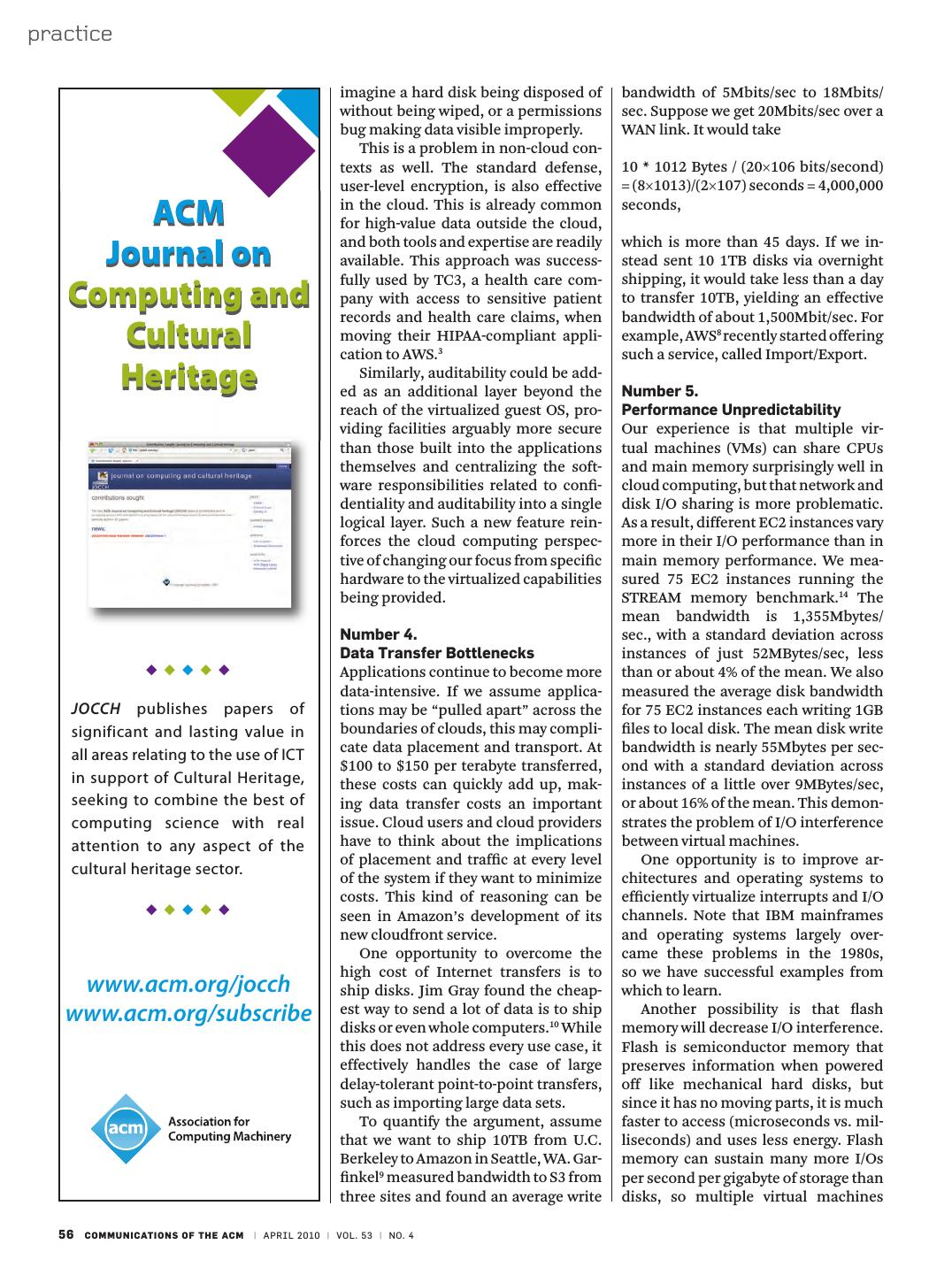 7 .practice imagine a hard disk being disposed of bandwidth of 5Mbits/sec to 18Mbits/ without being wiped, or a permissions sec. Suppose we get 20Mbits/sec over a bug making data visible improperly. WAN link. It would take This is a problem in non-cloud con- texts as well. The standard defense, 10 * 1012 Bytes / (20×106 bits/second) user-level encryption, is also effective = (8×1013)/(2×107) seconds = 4,000,000 ACM in the cloud. This is already common for high-value data outside the cloud, seconds, Journal on and both tools and expertise are readily available. This approach was success- which is more than 45 days. If we in- stead sent 10 1TB disks via overnight fully used by TC3, a health care com- shipping, it would take less than a day Computing and pany with access to sensitive patient to transfer 10TB, yielding an effective bandwidth of about 1,500Mbit/sec. For records and health care claims, when Cultural moving their HIPAA-compliant appli- cation to AWS.3 example, AWS8 recently started offering such a service, called Import/Export. Heritage Similarly, auditability could be add- ed as an additional layer beyond the Number 5. reach of the virtualized guest OS, pro- Performance Unpredictability viding facilities arguably more secure Our experience is that multiple vir- than those built into the applications tual machines (VMs) can share CPUs themselves and centralizing the soft- and main memory surprisingly well in ware responsibilities related to confi- cloud computing, but that network and dentiality and auditability into a single disk I/O sharing is more problematic. logical layer. Such a new feature rein- As a result, different EC2 instances vary forces the cloud computing perspec- more in their I/O performance than in tive of changing our focus from specific main memory performance. We mea- hardware to the virtualized capabilities sured 75 EC2 instances running the being provided. STREAM memory benchmark.14 The mean bandwidth is 1,355Mbytes/ Number 4. sec., with a standard deviation across Data Transfer Bottlenecks instances of just 52MBytes/sec, less � � � � � Applications continue to become more than or about 4% of the mean. We also data-intensive. If we assume applica- measured the average disk bandwidth JOCCH publishes papers of tions may be “pulled apart” across the for 75 EC2 instances each writing 1GB significant and lasting value in boundaries of clouds, this may compli- files to local disk. The mean disk write all areas relating to the use of ICT cate data placement and transport. At bandwidth is nearly 55Mbytes per sec- $100 to $150 per terabyte transferred, ond with a standard deviation across in support of Cultural Heritage, these costs can quickly add up, mak- instances of a little over 9MBytes/sec, seeking to combine the best of ing data transfer costs an important or about 16% of the mean. This demon- computing science with real issue. Cloud users and cloud providers strates the problem of I/O interference attention to any aspect of the have to think about the implications between virtual machines. of placement and traffic at every level One opportunity is to improve ar- cultural heritage sector. of the system if they want to minimize chitectures and operating systems to costs. This kind of reasoning can be efficiently virtualize interrupts and I/O � � � � � seen in Amazon’s development of its channels. Note that IBM mainframes new cloudfront service. and operating systems largely over- One opportunity to overcome the came these problems in the 1980s, high cost of Internet transfers is to so we have successful examples from www.acm.org/jocch ship disks. Jim Gray found the cheap- which to learn. www.acm.org/subscribe est way to send a lot of data is to ship disks or even whole computers.10 While Another possibility is that flash memory will decrease I/O interference. this does not address every use case, it Flash is semiconductor memory that effectively handles the case of large preserves information when powered delay-tolerant point-to-point transfers, off like mechanical hard disks, but such as importing large data sets. since it has no moving parts, it is much To quantify the argument, assume faster to access (microseconds vs. mil- that we want to ship 10TB from U.C. liseconds) and uses less energy. Flash Berkeley to Amazon in Seattle, WA. Gar- memory can sustain many more I/Os finkel9 measured bandwidth to S3 from per second per gigabyte of storage than three sites and found an average write disks, so multiple virtual machines 56 comm unicatio ns o f the acm | apr i l 201 0 | vol. 5 3 | no. 4