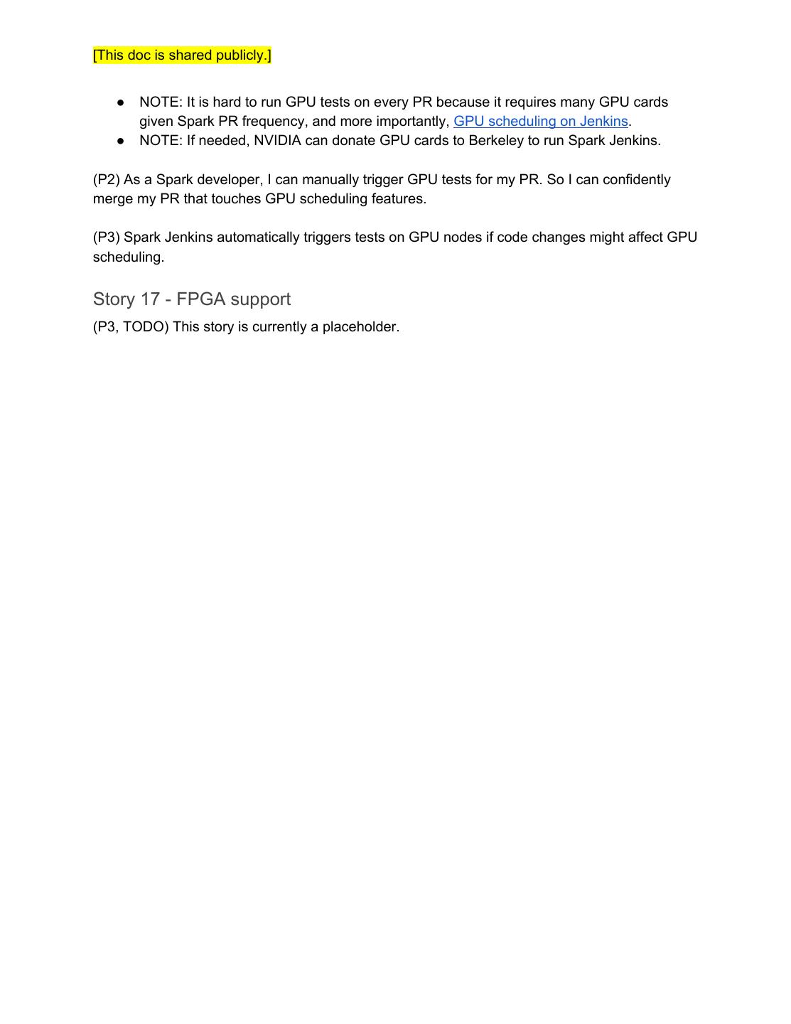7 .[This doc is shared publicly.] ● NOTE: It is hard to run GPU tests on every PR because it requires many GPU cards given Spark PR frequency, and more importantly, GPU scheduling on Jenkins. ● NOTE: If needed, NVIDIA can donate GPU cards to Berkeley to run Spark Jenkins. (P2) As a Spark developer, I can manually trigger GPU tests for my PR. So I can confidently merge my PR that touches GPU scheduling features. (P3) Spark Jenkins automatically triggers tests on GPU nodes if code changes might affect GPU scheduling. Story 17 - FPGA support (P3, TODO) This story is currently a placeholder.