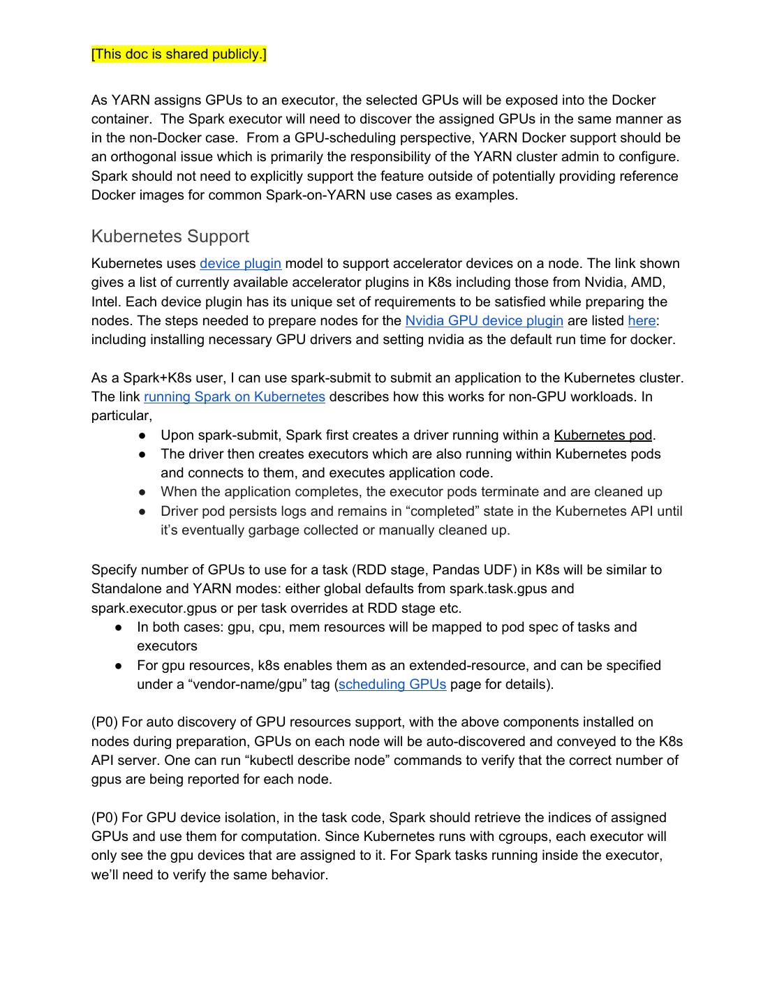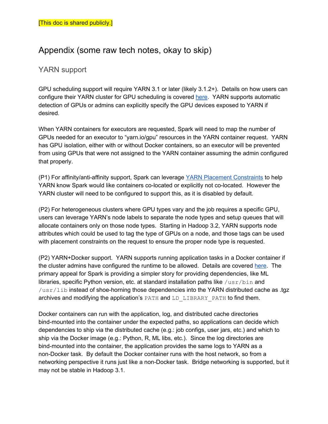 8 .[This doc is shared publicly.] Appendix (some raw tech notes, okay to skip) YARN support GPU scheduling support will require YARN 3.1 or later (likely 3.1.2+). Details on how users can configure their YARN cluster for GPU scheduling is covered here. YARN supports automatic detection of GPUs or admins can explicitly specify the GPU devices exposed to YARN if desired. When YARN containers for executors are requested, Spark will need to map the number of GPUs needed for an executor to “yarn.io/gpu” resources in the YARN container request. YARN has GPU isolation, either with or without Docker containers, so an executor will be prevented from using GPUs that were not assigned to the YARN container assuming the admin configured that properly. (P1) For affinity/anti-affinity support, Spark can leverage YARN Placement Constraints to help YARN know Spark would like containers co-located or explicitly not co-located. However the YARN cluster will need to be configured to support this, as it is disabled by default. (P2) For heterogeneous clusters where GPU types vary and the job requires a specific GPU, users can leverage YARN’s node labels to separate the node types and setup queues that will allocate containers only on those node types. Starting in Hadoop 3.2, YARN supports node attributes which could be used to tag the type of GPUs on a node, and those tags can be used with placement constraints on the request to ensure the proper node type is requested. (P2) YARN+Docker support. YARN supports running application tasks in a Docker container if the cluster admins have configured the runtime to be allowed. Details are covered here. The primary appeal for Spark is providing a simpler story for providing dependencies, like ML libraries, specific Python version, etc. at standard installation paths like /usr/bin and /usr/lib instead of shoe-horning those dependencies into the YARN distributed cache as .tgz archives and modifying the application’s PATH and LD_LIBRARY_PATH to find them. Docker containers can run with the application, log, and distributed cache directories bind-mounted into the container under the expected paths, so applications can decide which dependencies to ship via the distributed cache (e.g.: job configs, user jars, etc.) and which to ship via the Docker image (e.g.: Python, R, ML libs, etc.). Since the log directories are bind-mounted into the container, the application provides the same logs to YARN as a non-Docker task. By default the Docker container runs with the host network, so from a networking perspective it runs just like a non-Docker task. Bridge networking is supported, but it may not be stable in Hadoop 3.1.